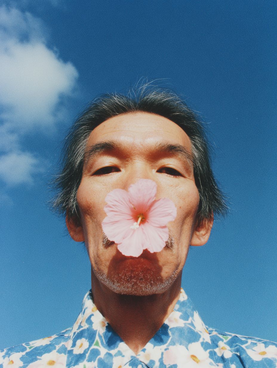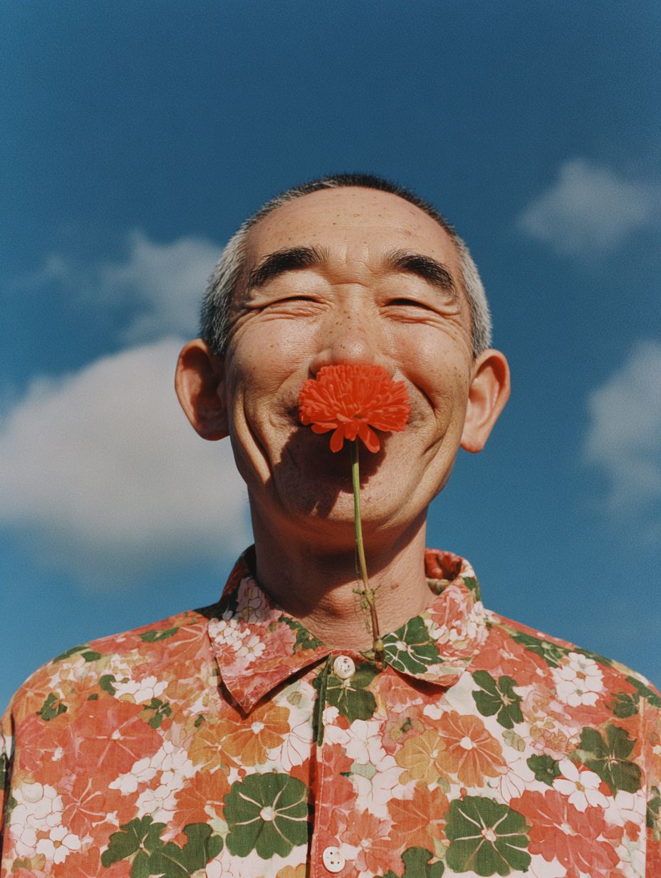 マーティン・パーのスタイルで、花を口元に持って微笑んでいる日本の男性の写真を作成してください。背景には空があり、1996年の日本の夏の雰囲気を感じさせる。