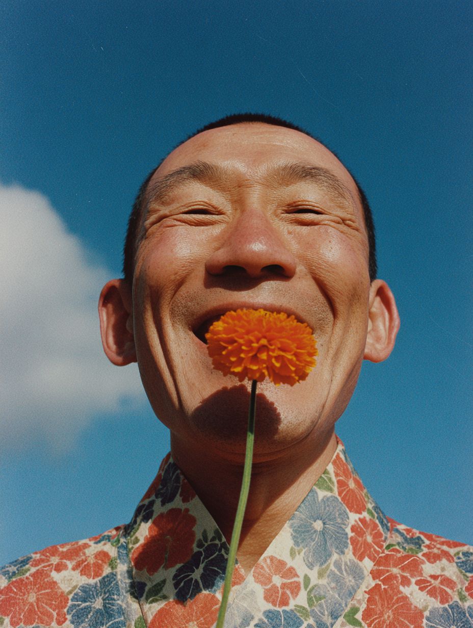 MARTIN PARR STYLE, CREATE A PHOTO OF A SMILING japanese MAN HOLDING A FLOWER IN FRONT OF HIS MOUTH, BEHIND HIM IS THE SKY, japan 1996, summer vibes --ar 3:4 --profile kzilt9y --v 7.0
