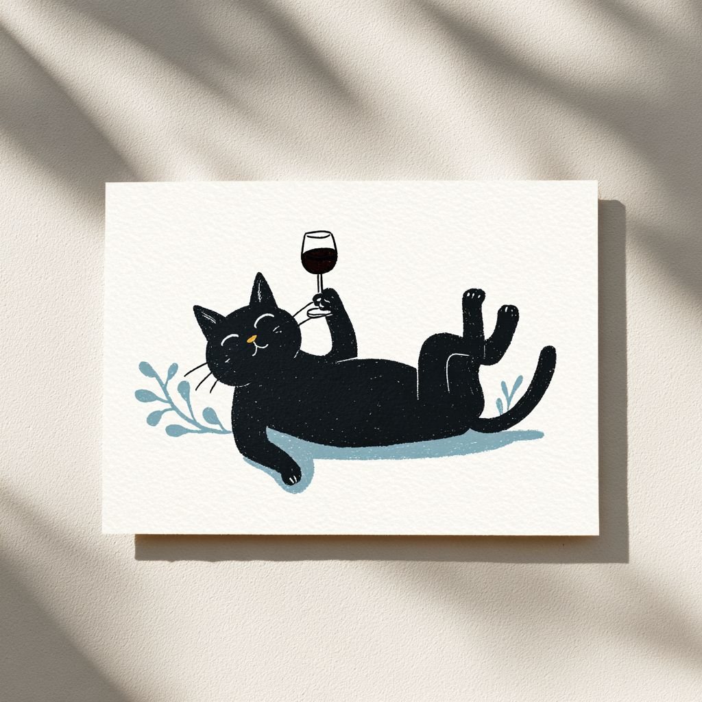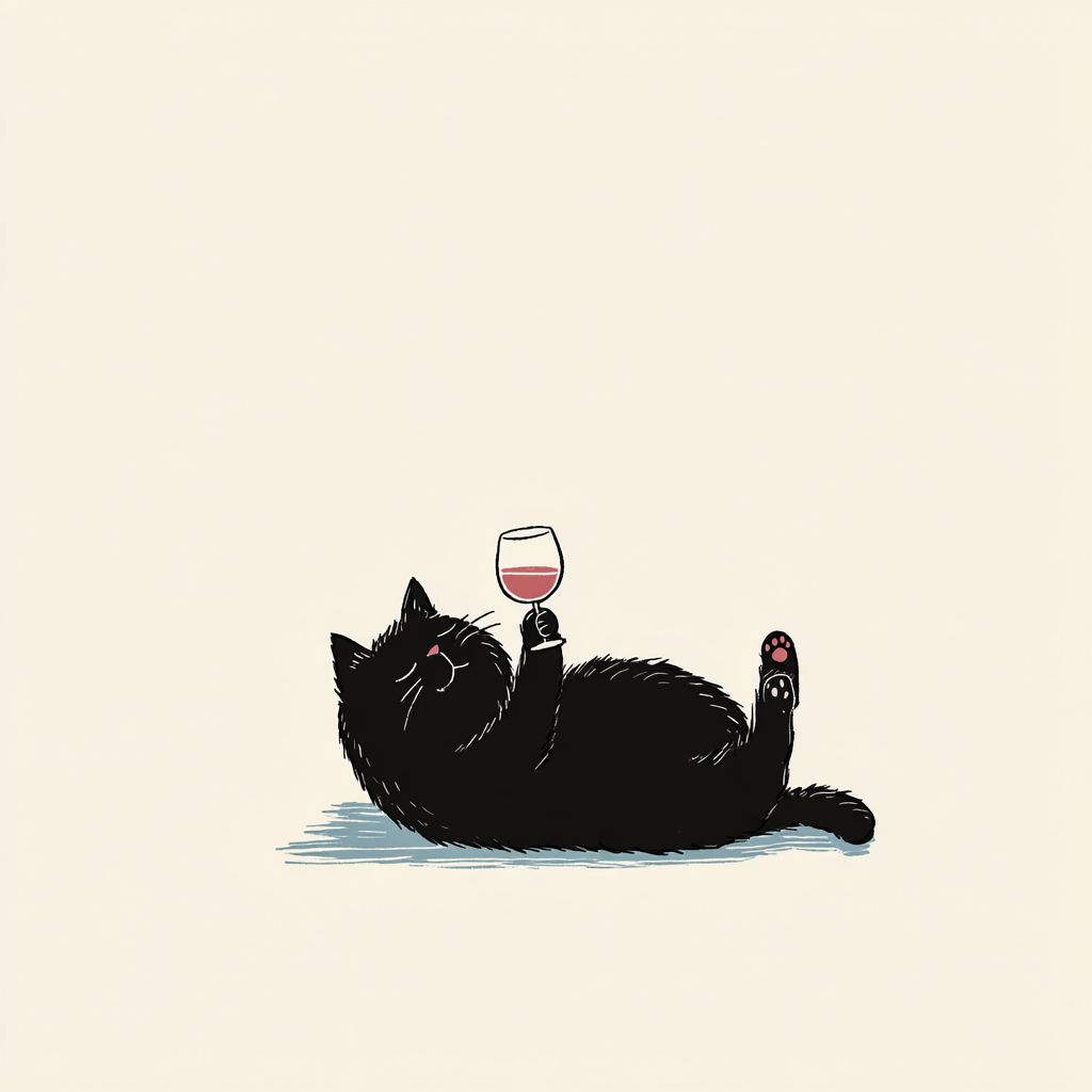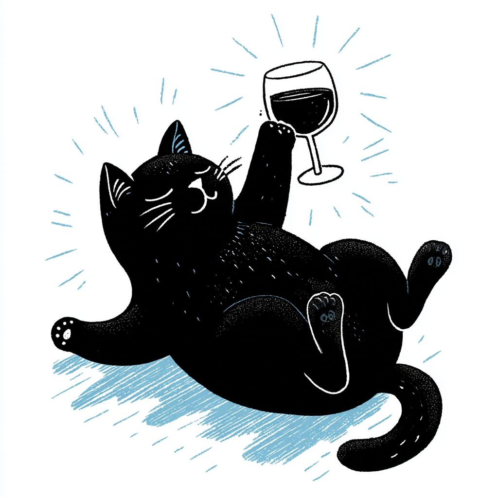 a black cat lying on its back, holding up a glass of wine in its paws and drinking it with both paws, in a simple flat illustration style, on a white background, with a minimalist art style, a white border, and blue lines, a simple drawing. --v 7.0