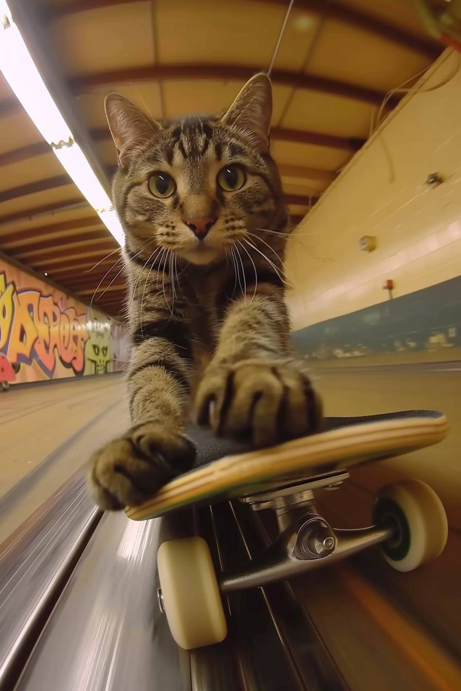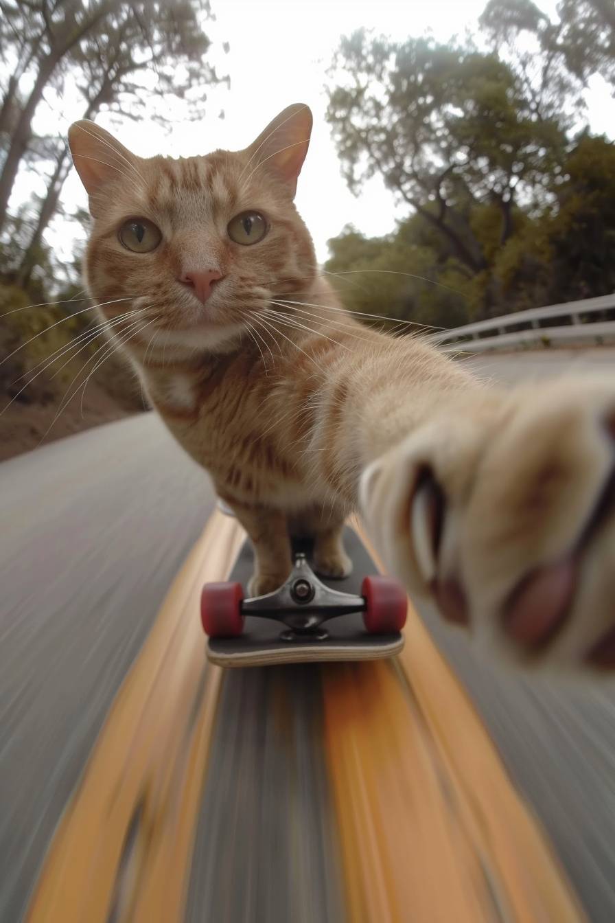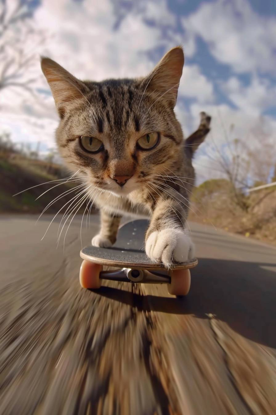 猫がスケートボードに乗っている。すべての足がボードの上にあり、動きがぼやけたリアルな映像。