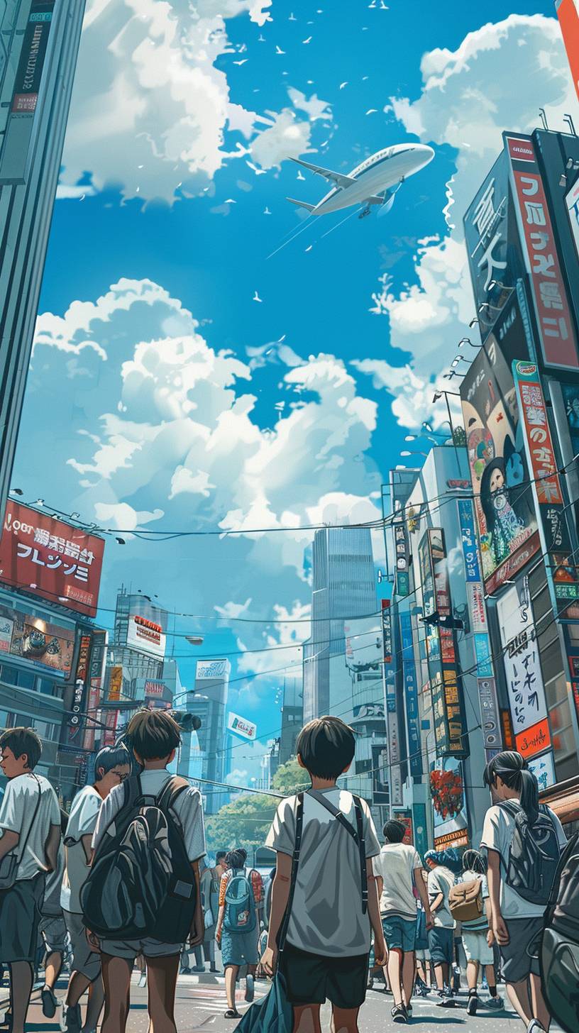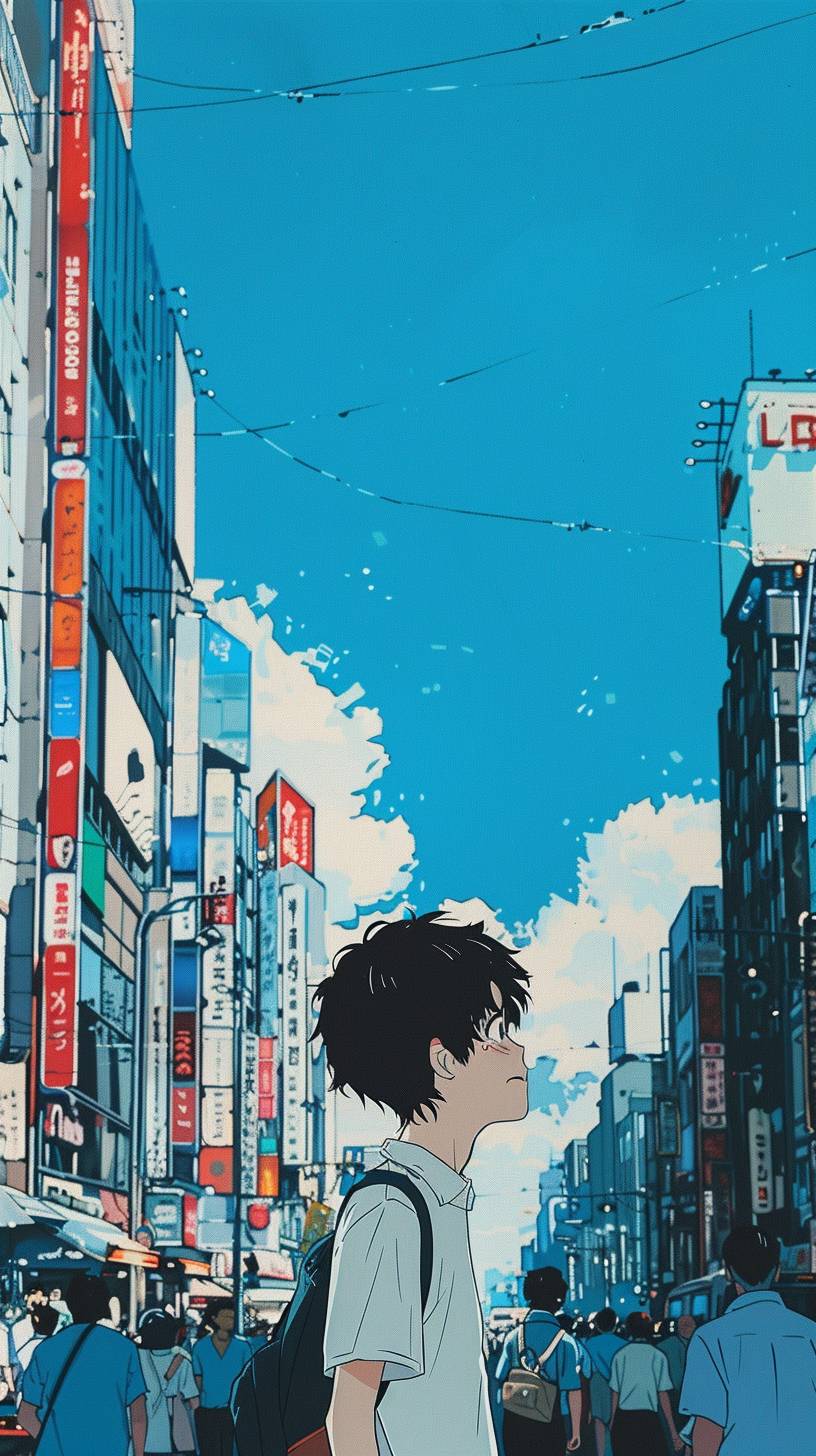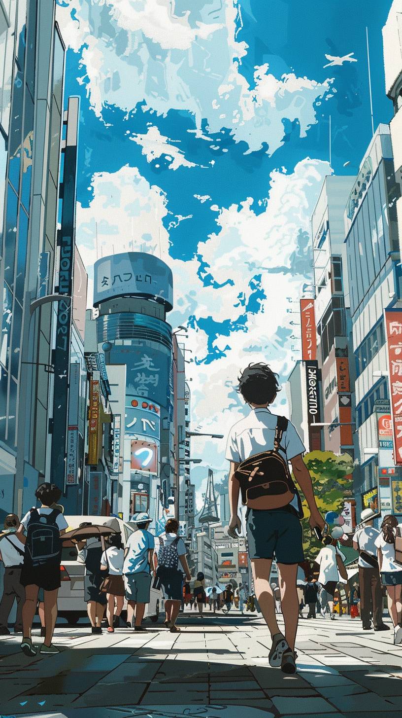 A boy is crying in the streets of Shibuya, cartoonish, people are walking from side to side, but only the Boy is facing towards me, her hair is short and black, and her clothes are mini, which is currently trendy. wearing a skirt. Depicted with Hayao Miyazaki-style drawings. sky blue sky--s 400 --ar 9:16 --v 6.0