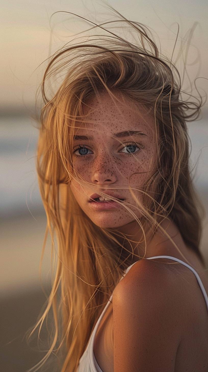 blond tall and slim girl with freckles and blues eyes with long hair floating in the air and passing in front of the face, with some lock of hair hidding her face, standing near the sea at evening summer at sunset with pastel atmosphere, wearing a white tank top without jewerly--ar 9:16 --ar 9:16 --style raw --v 6.0