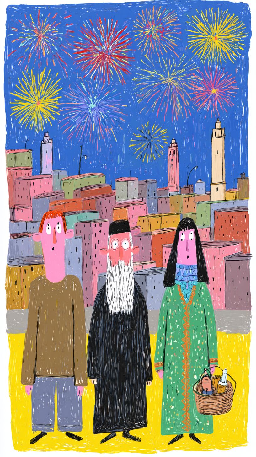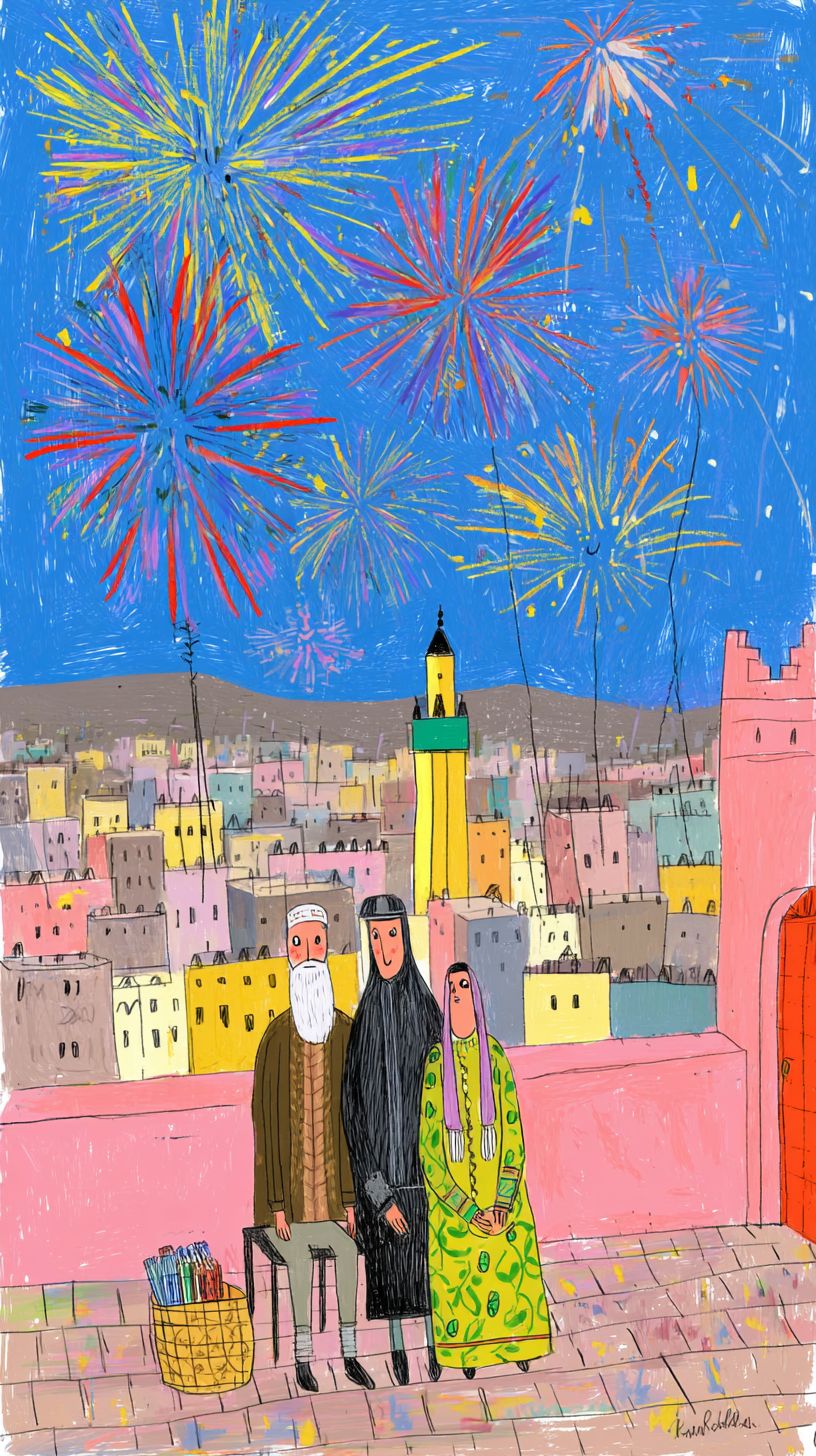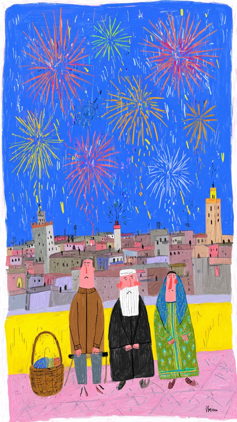 前の作品と同じスタイルの手描きのアニメーションで、夜のフェズを舞台にしています。シーンでは、街の象徴的なキャラクター3人が、メディナを見渡せる屋上テラスに座っているまたは立っている様子が描かれています。伝統的な皮革職人がシンプルな作業服を着ており、年老いた宗教学者は黒いジャラバを着て白いターバンを固定していて、女性商人は豊かな刺繍が施された緑のカフタンを着てスカーフをまとい、彼女のバスケットがそばに置かれています。彼らは半近距離で描かれ、顔と上半身がはっきりと見え、上を見上げています。空にはカラフルな花火が屋根の上で爆発し、赤、金、青の光の閃光がキャラクターと近くのミナレットを照らします。アニメーションは花火の光が彼らの顔に変化する様子を強調し、彼らの表情には驚きと喜びが表れています。背景の都市景観は静的で手描きのままで、唯一の動きはきらめく花火と3人のキャラクターの微妙な反応から来ています。雰囲気は詩的で祝祭的であり、フェズの文化的アイデンティティに深く結びついている必要があります。