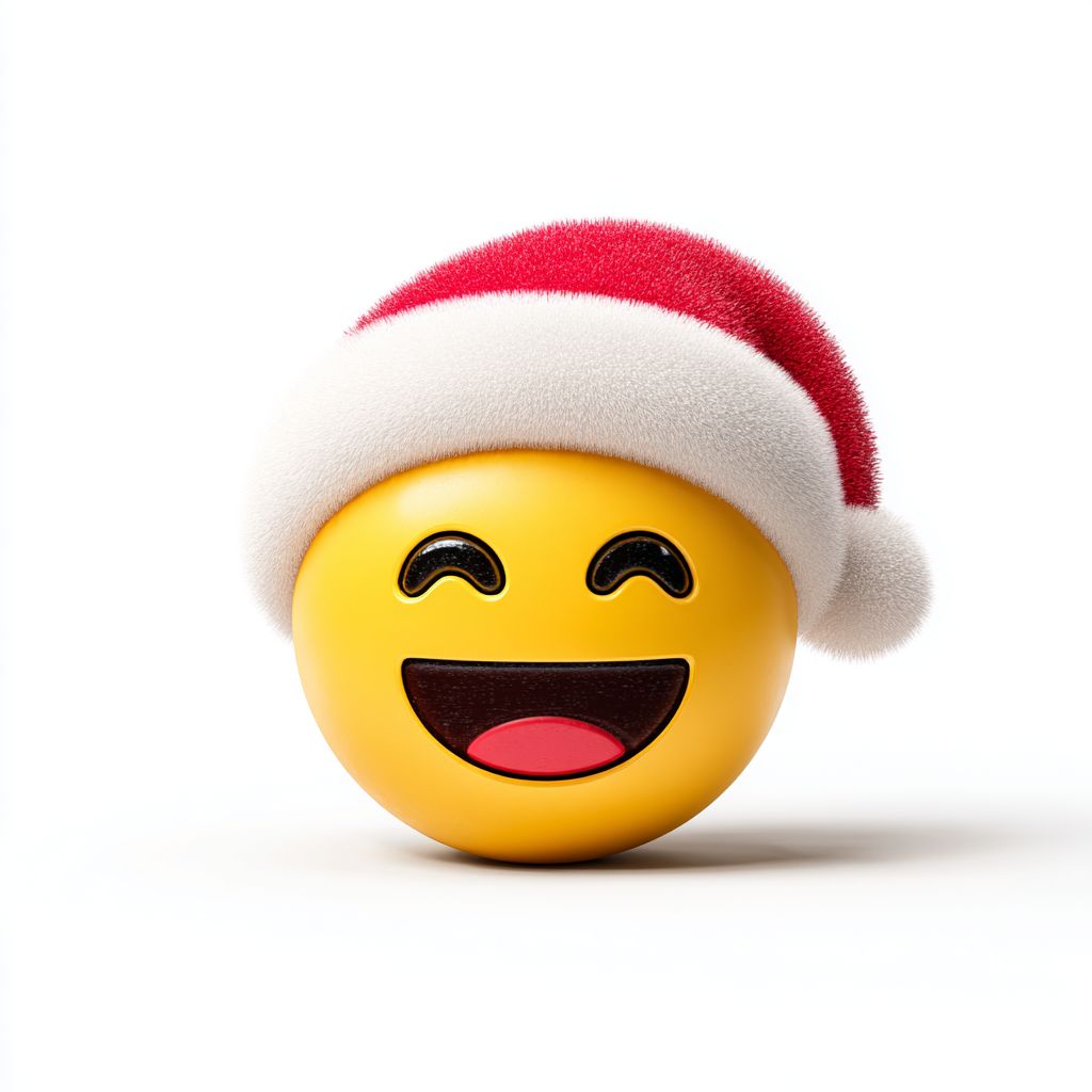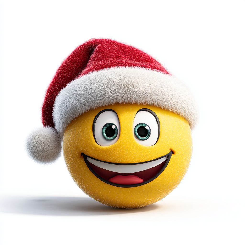 サンタ帽をかぶった幸せな絵文字、高解像度、8K、ぼやけていない、シャープなディテール、高品質のレンダリング、白い背景上