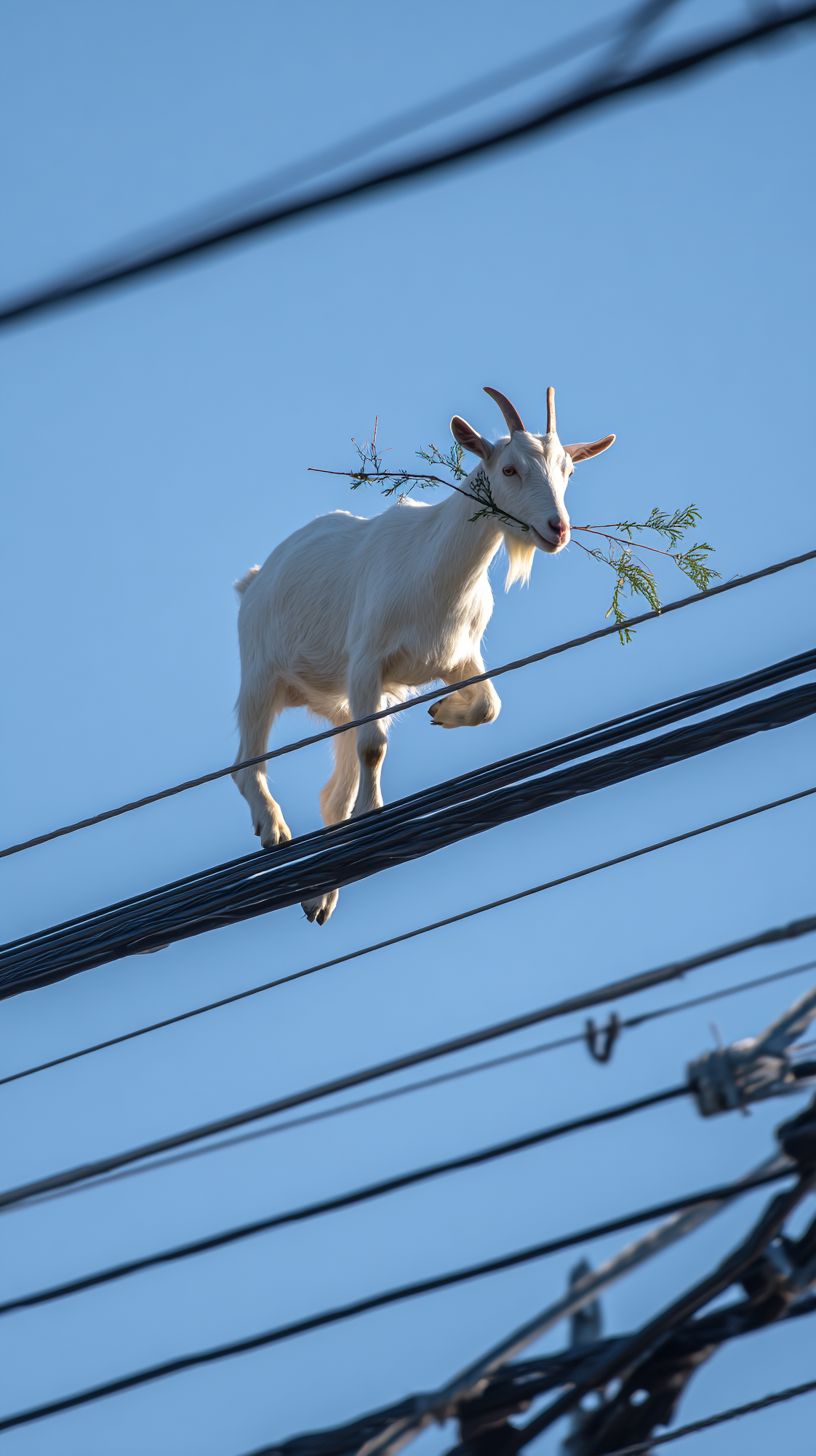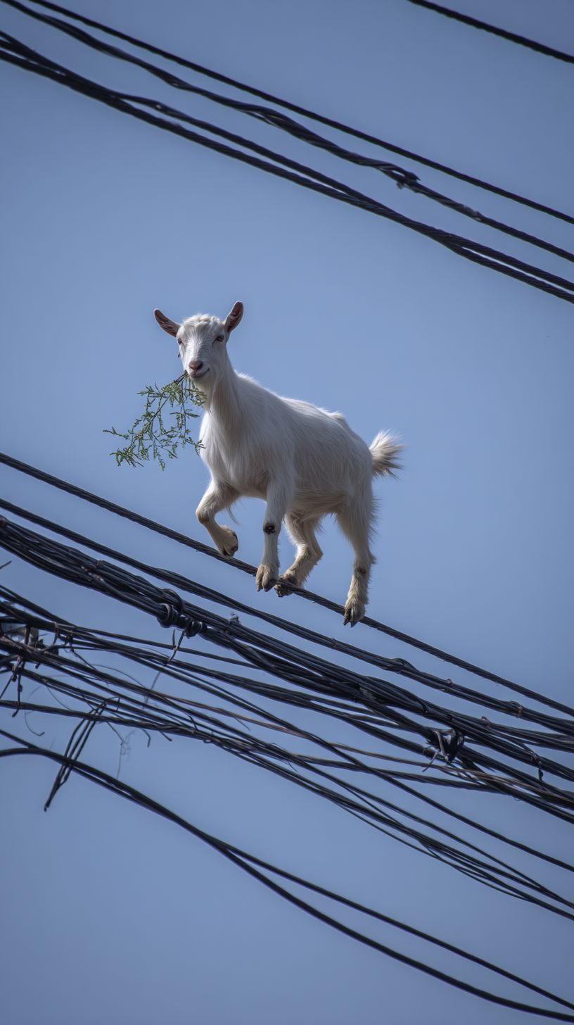 これは、白いヤギが電力線の上を歩いている驚くべき瞬間を捉えた写真です。ヤギは中央の少し左に位置しており、前足を持ち上げて後足を伸ばしながら歩いています。毛は純白で、小さな角が見えます。ヤギは口の中に小さな緑の枝をくわえており、シーンに遊び心を加えています。背景には晴れた青空が広がり、昼間であることを示しています。黒い電力線が数多く交差して、網のようなパターンを作り出しています。電線は金属のタワーで支えられており、そのうちの1つが画像の下中央に見えます。写真は低い角度から撮影されており、ヤギの大胆な行為と電力線の高さを強調しています。