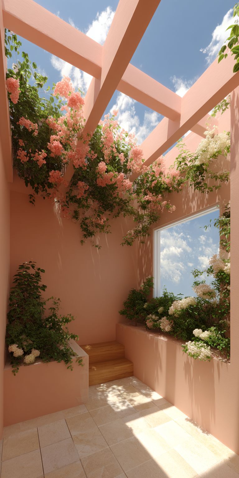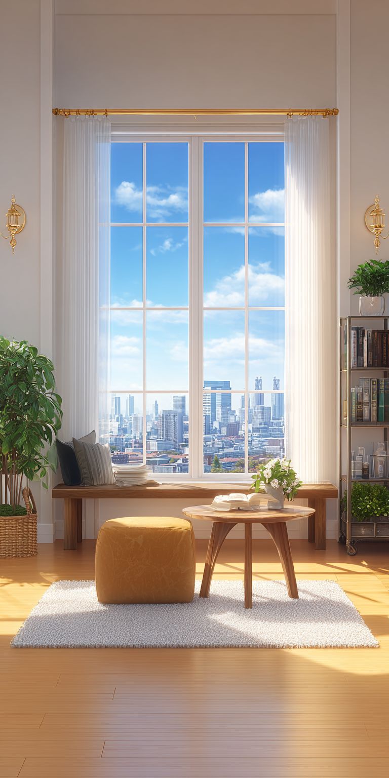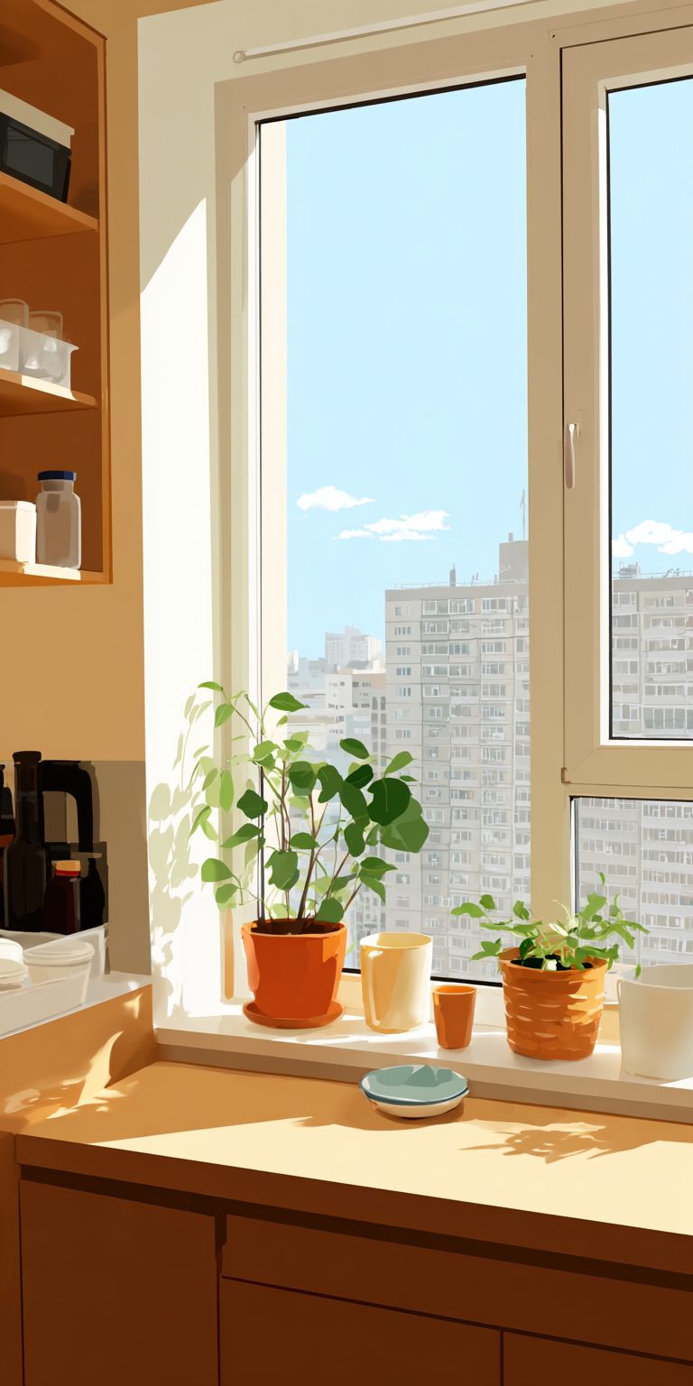 日当たりの良いアパートにあるホームガーデン、アニメスタイルの暖かいパステルカラーのイラスト