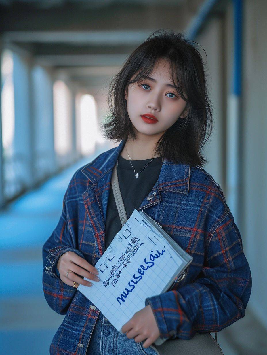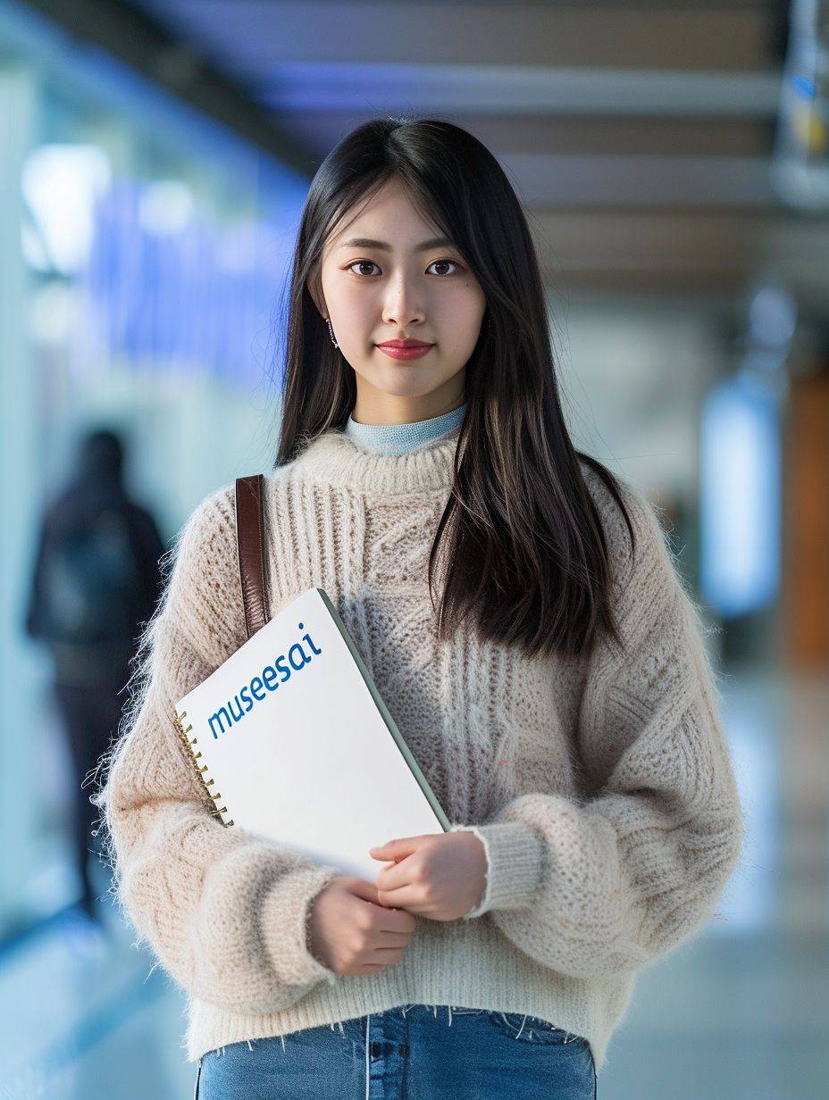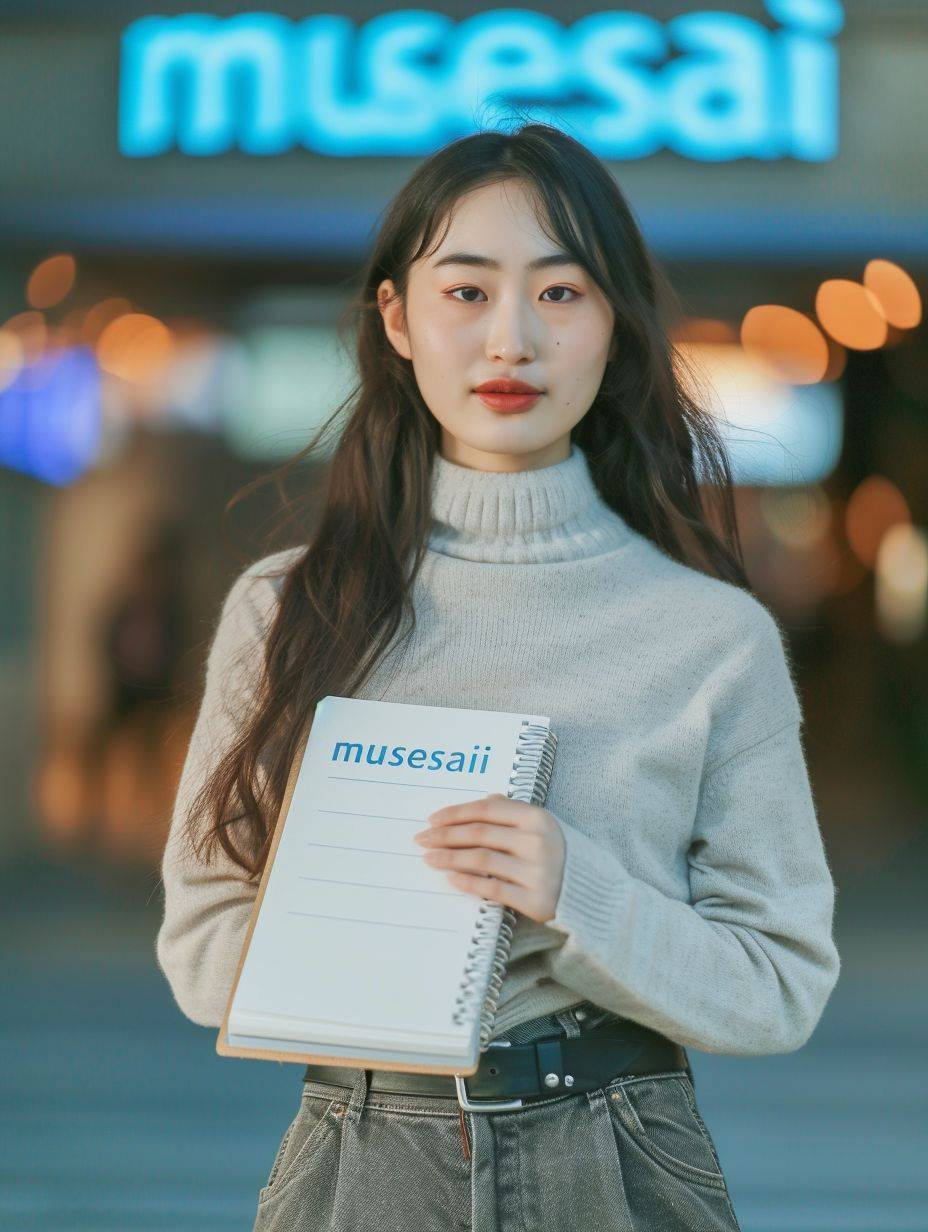 25歳の中国人女性が立っており、左手に「musesai」と書かれたノートを持っています。中立的な表情でカメラを見つめ、背景はぼやけています。