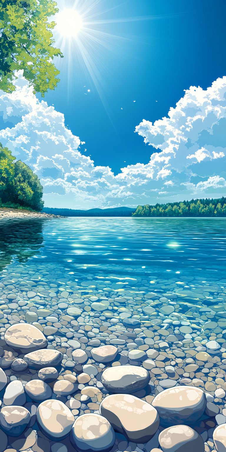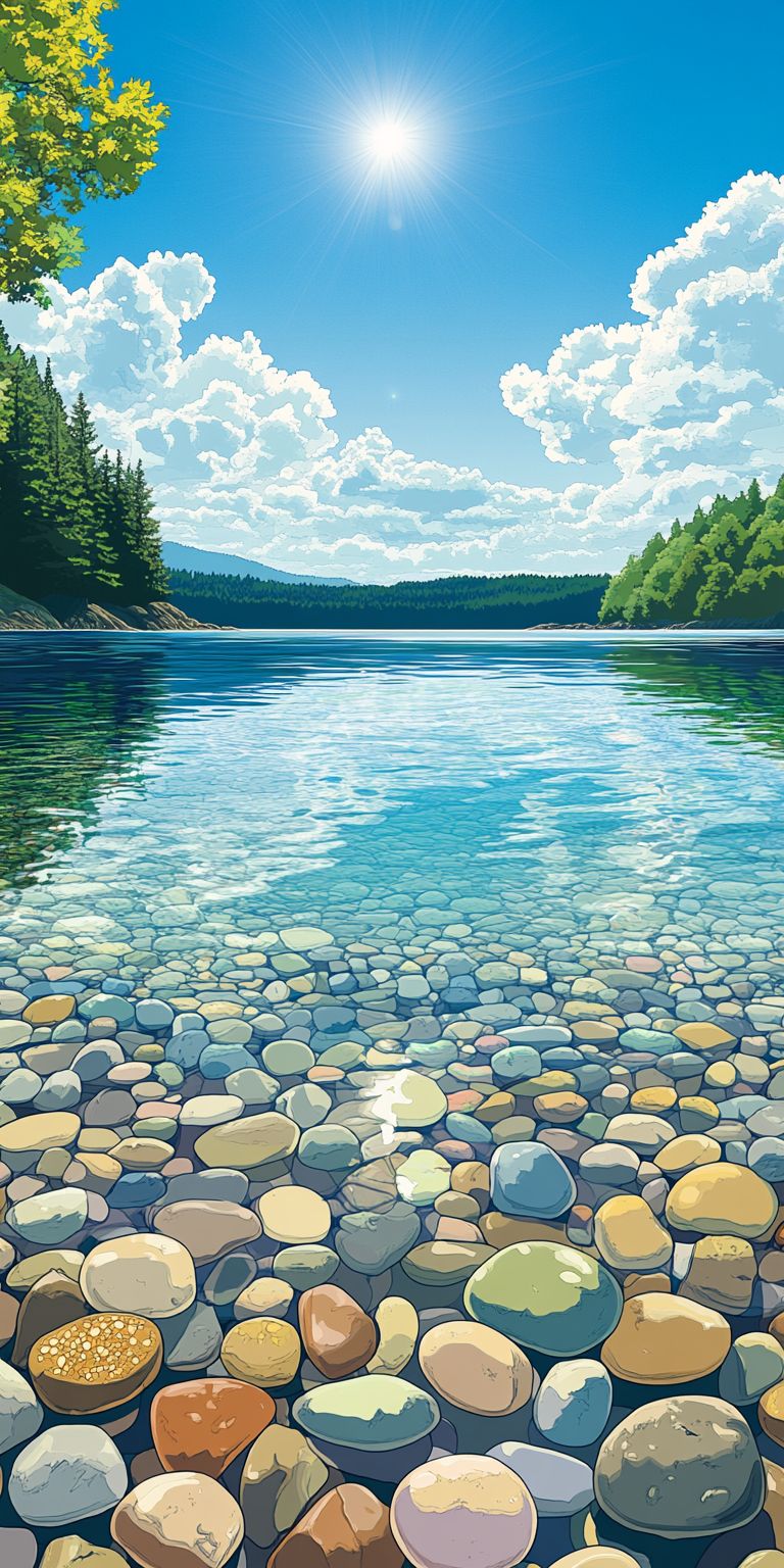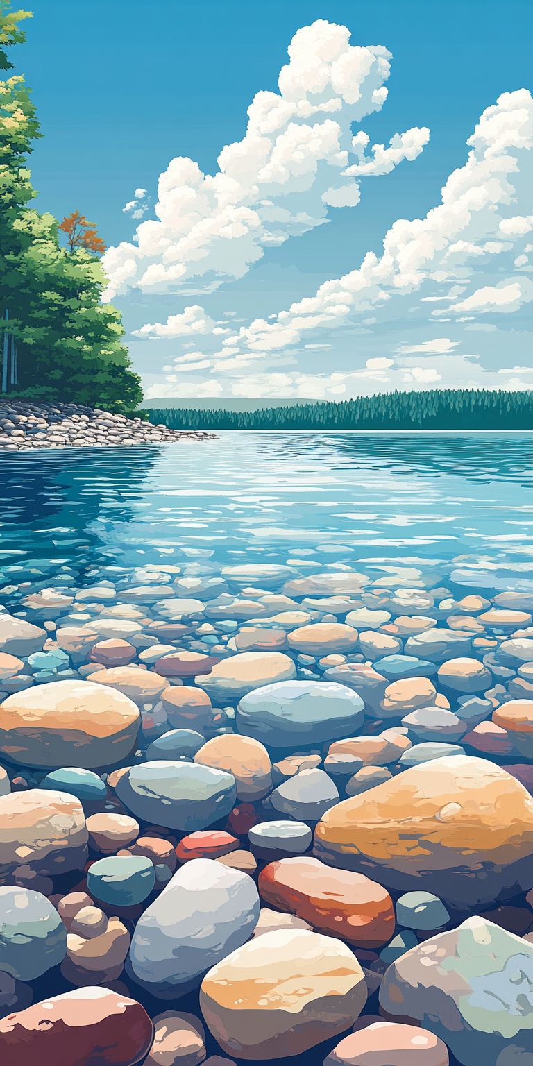 colorful miyazaki style vector illustration of clear water with pebbles on the shore. the blue sky has white clouds and is sunny, and there's an endless lake in front of you. in the distance behind it lies dense forests. --ar 1:2 --v 6.1