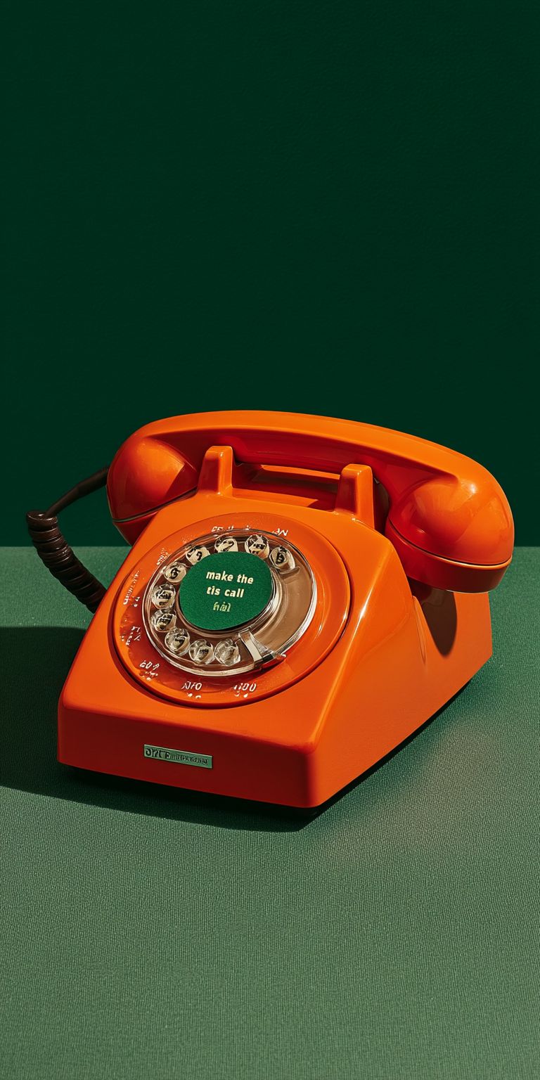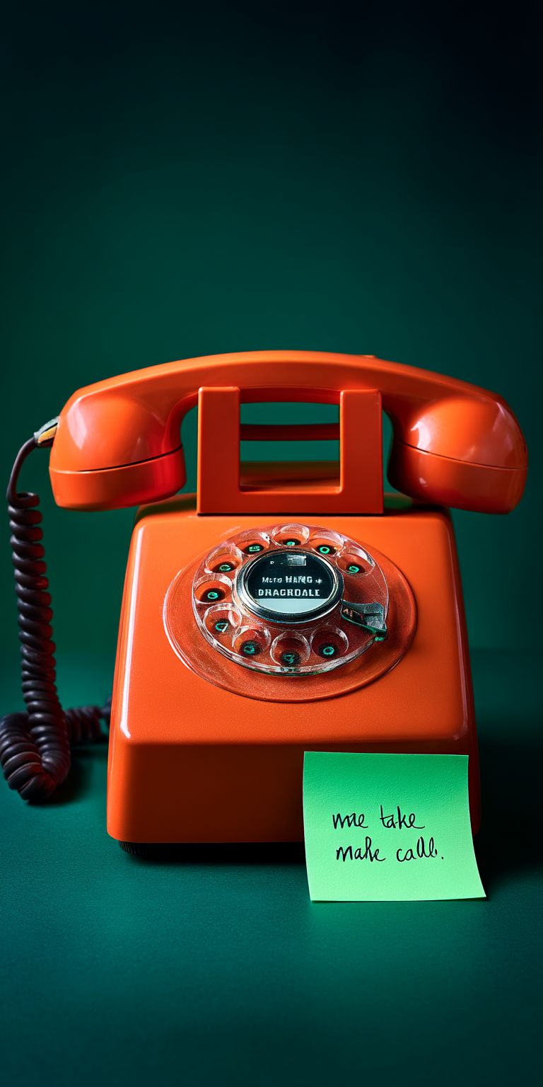 鮮やかなオレンジ色のレトロなダイヤル電話、電話の受話器に「電話をかける」と手書きされた緑の付箋が貼られている、ドラマティックなスタジオ照明、HEX #364B47に触発されたリッチな深いフォレストグリーンの背景、強いコントラストのためのダークマットなバックドロップ、大胆な影、1970年代にインスパイアされたビンテージ映画のムード、高品質な商品写真スタイル、詳細でリアルな画像。