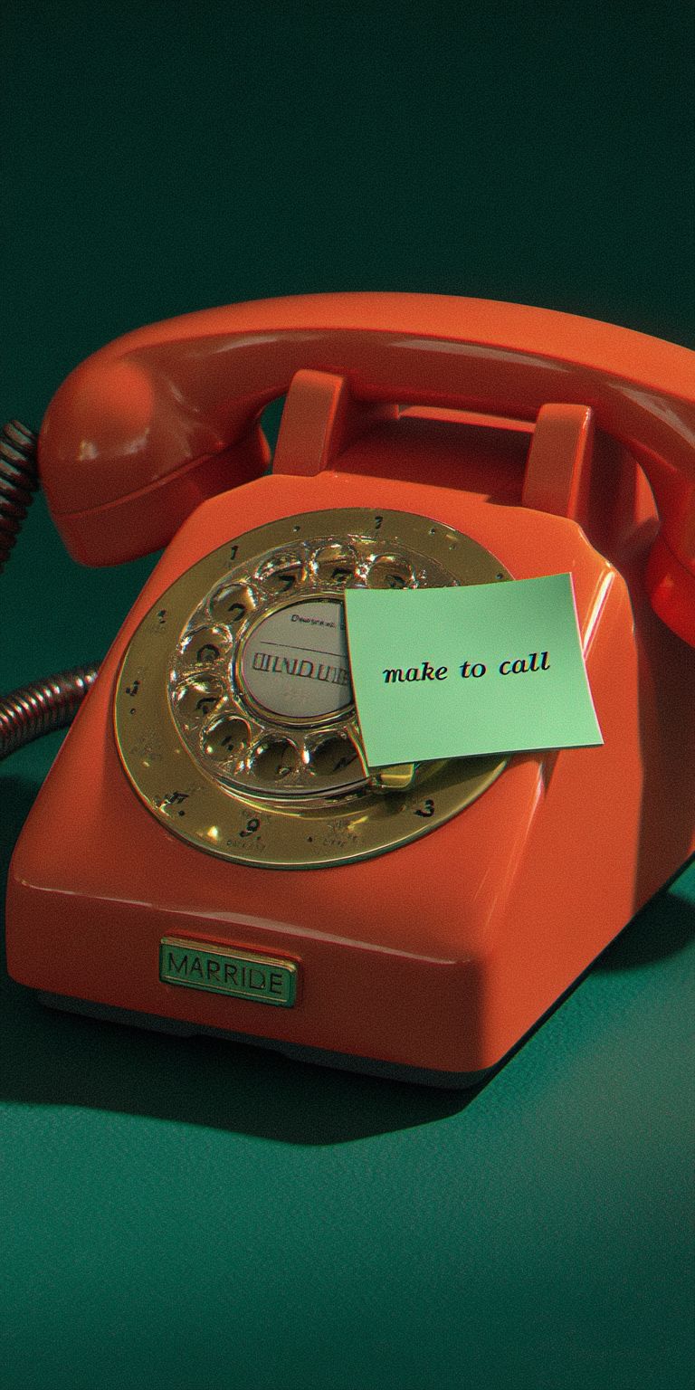 オレンジ色のレトロなダイヤル電話と「その電話をかけて」という緑の付箋