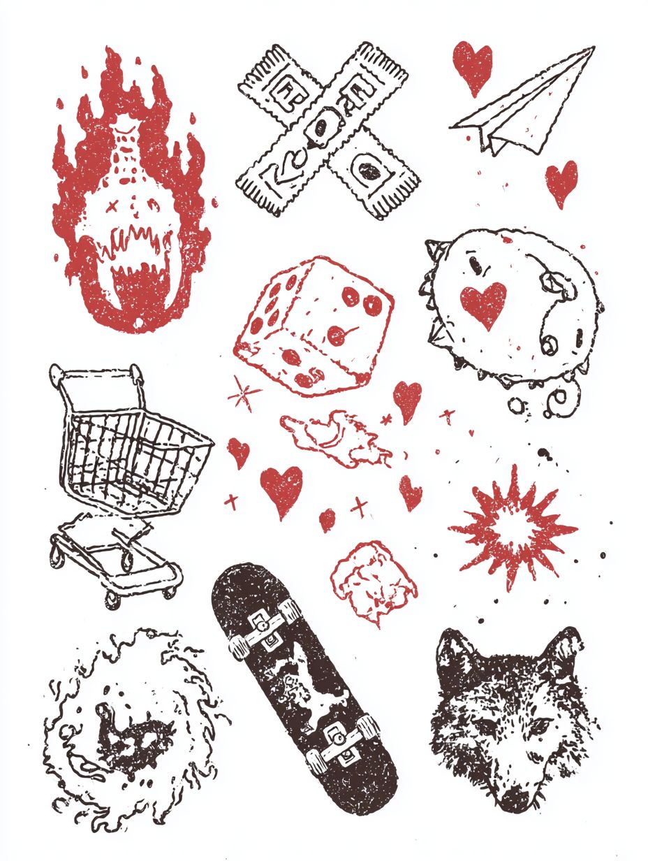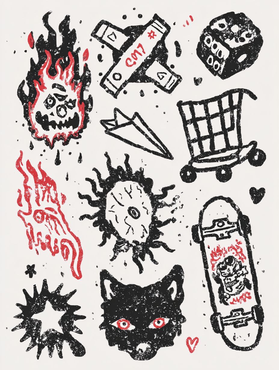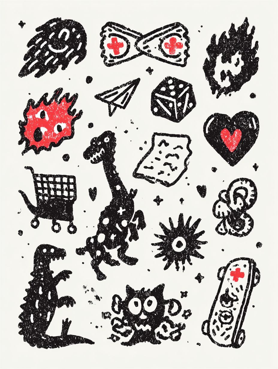 黒と赤のタトゥーフラッシュシートを作成し、グラフィティ風の無知スタイルで表現します。太く、荒々しいラインと遊び心のある不完全さ、ストリートアートのエネルギーを使います。含む要素:顔のある燃える隕石または彗星、竜脚類恐竜、中央にハートのある2つの交差したバンドエイド、翼にハートのある紙飛行機、数字の代わりにハートが表示された6面のサイコロ、空のショッピングカート、壊れた心のデザインのスケートボード、中央にハートのあるスターバーストパターン、笑っている紙と眉をひそめた紙の2枚、絡み合った抽象的な炎のような形、そして大きな目とその上に小さなハートを持つ狐やアライグマに似た動物の頭。構図はエッジィで自発的で、シェーディングや色なしのモノクロに保ちます。
