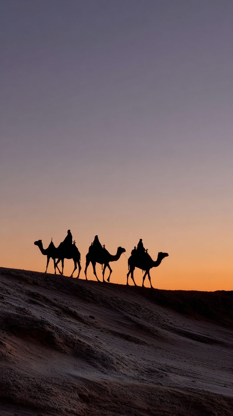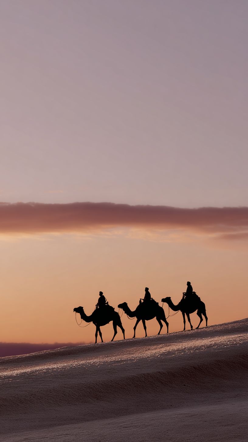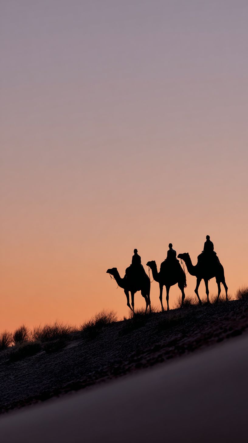 realistic silhouette of four camels and riders walking along desert ridge at sunset, orange and violet gradient sky, strong backlight, natural depth, no post-processing --ar 9:16 --profile 9yhbodn --v 7.0