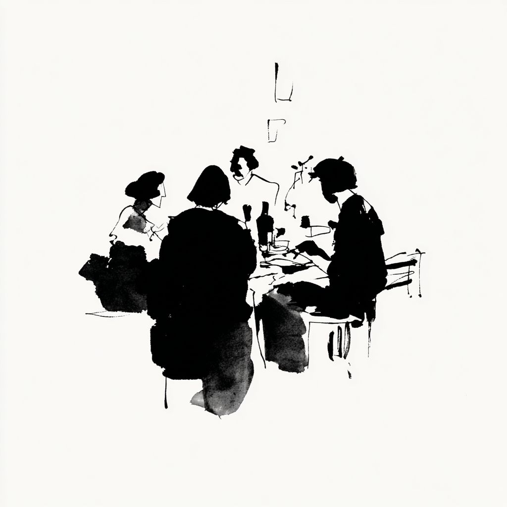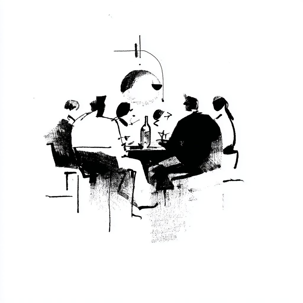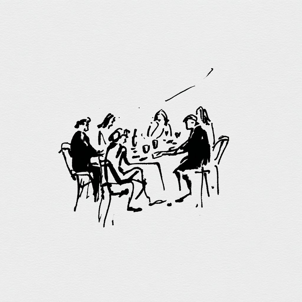 人々がテーブルの周りに座っている抽象的なシーンのシンプルな黒インク画