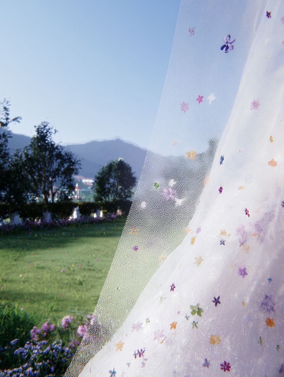 In a fresh and healing Japanese style, the first person perspective is adopted, and the picture is presented through three points of composition. In the foreground is a white tulle curtain that is light and transparent, with a soft pendant texture. On it, colored florets (pink, purple, yellow, etc.) are distributed with decorative elements in the shape of stars, which are everywhere throughout the curtain; The background is an outdoor garden scene in the early morning, with green grass, dense trees and clear blue sky. The overall use of macarons color matching, realistic photography style with a slight dreamlike spot effect, creating a depth of field effect of looking at the garden through the gauche curtain, focusing on the details of the curtain and the natural landscape in the background, delivering a warm and healing atmosphere. --chaos 20 --ar 3:4 --raw --stylize 50