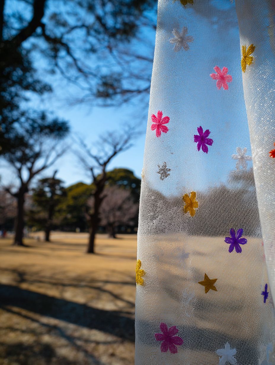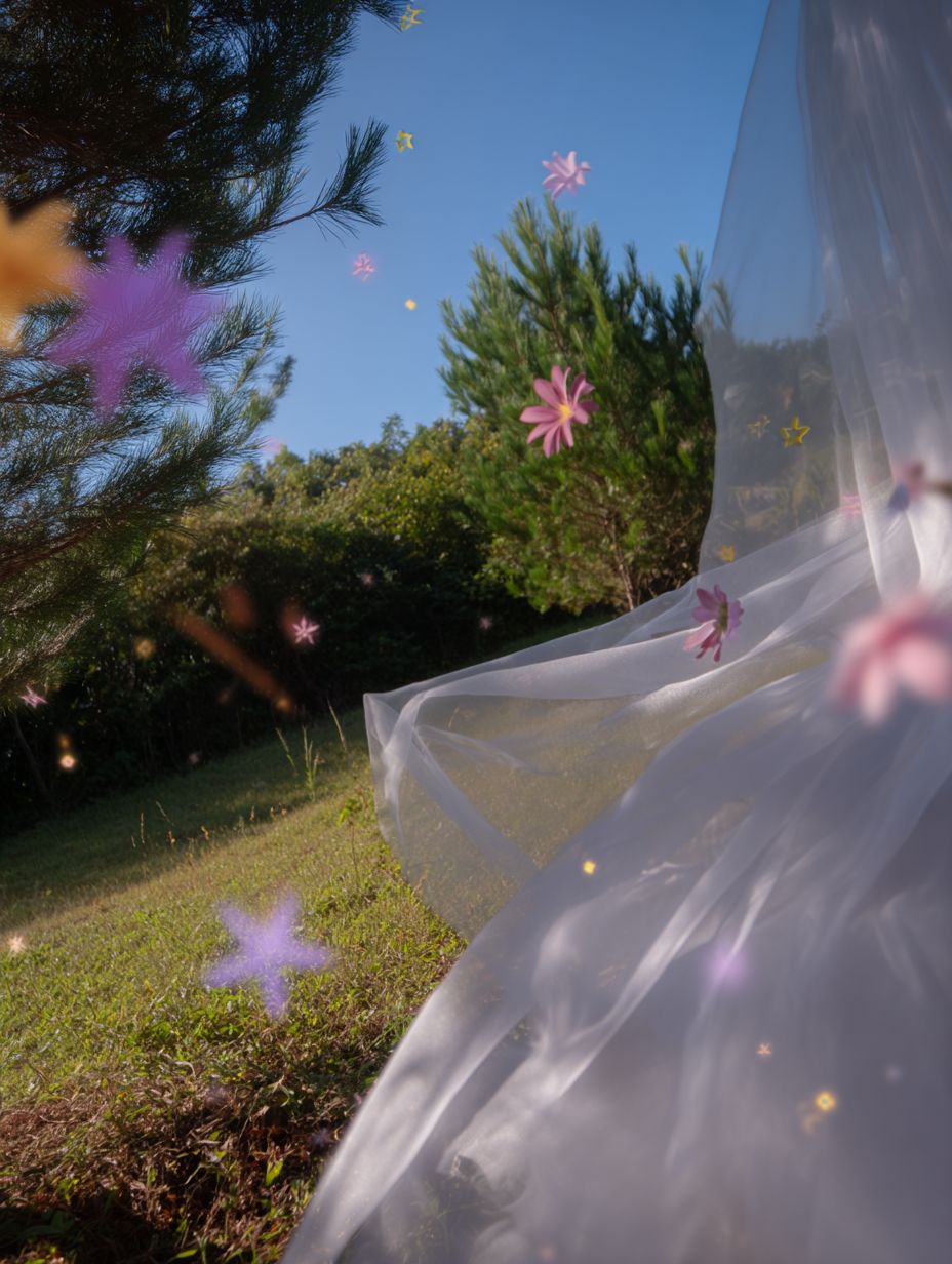 新鮮で癒しのある日本スタイルで、私は一人称視点を採用し、3つの構成ポイントを通じて絵を提示しています。前景には軽やかで透明な白いチュールカーテンがあり、柔らかい垂れ感があります。その上には、色とりどりの花(ピンク、紫、黄色など)が散りばめられ、星形の装飾要素がカーテン全体に広がっています;背景は早朝のアウトドアガーデンの景色で、緑の草、密集した木々、澄んだ青空があります。全体的にはマカロンカラーのコーディネートを使用し、やや夢のようなスポット効果があるリアルな写真スタイルで、カーテン越しに庭を見つめる深度効果を生み出し、カーテンのディテールと背景の自然の風景に焦点を当て、温かく癒しのある雰囲気を伝えています。