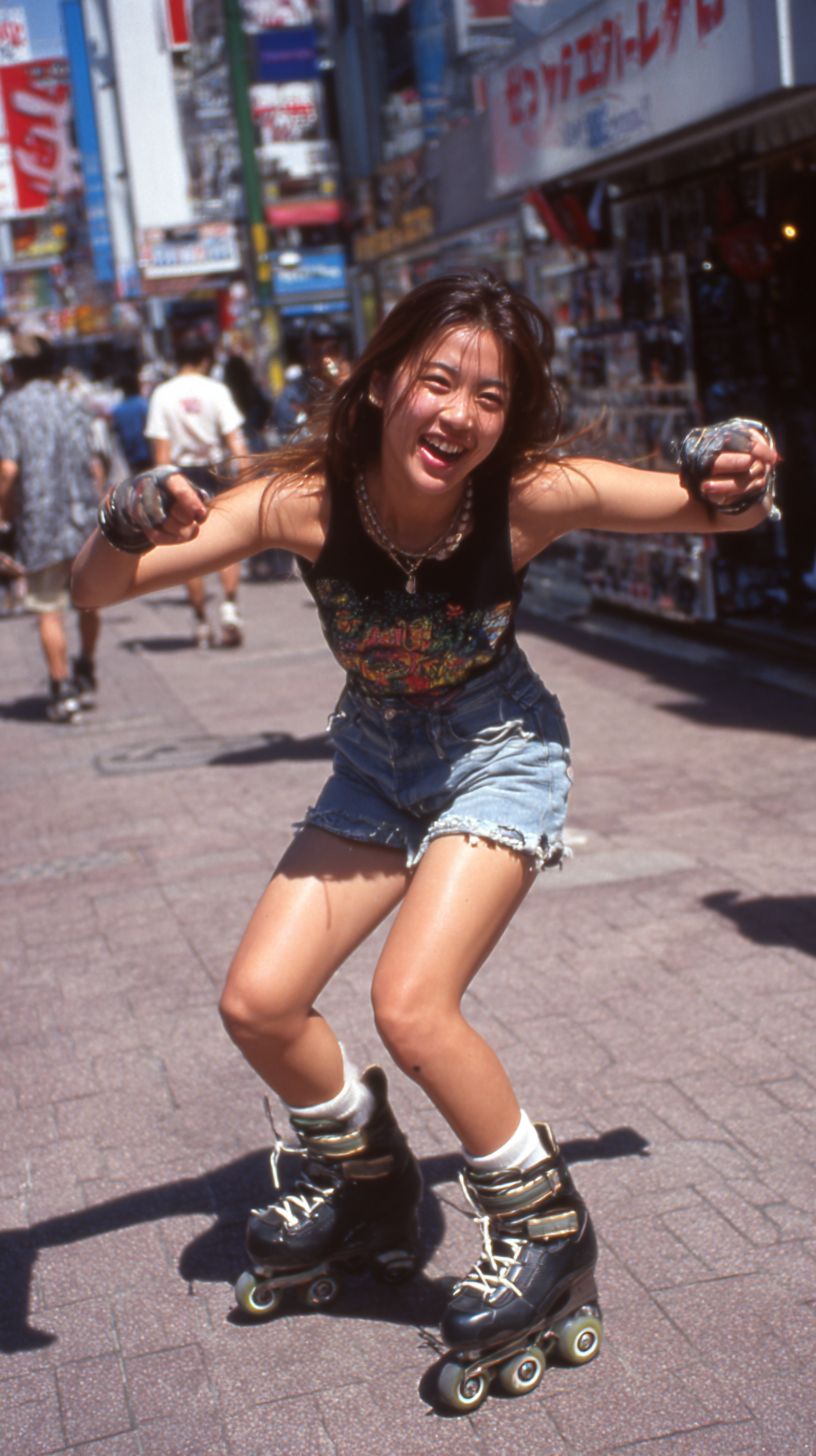 A young Japanese woman in streetwear wearing rollerblade dancing toward the camera in mid-step with a light hearted expression, midday street, 2000s digital camera style, in Shibuya, Tokya circa late spring 2000,-- ar 9:16 --chaos 15 --ar 9:16 --raw