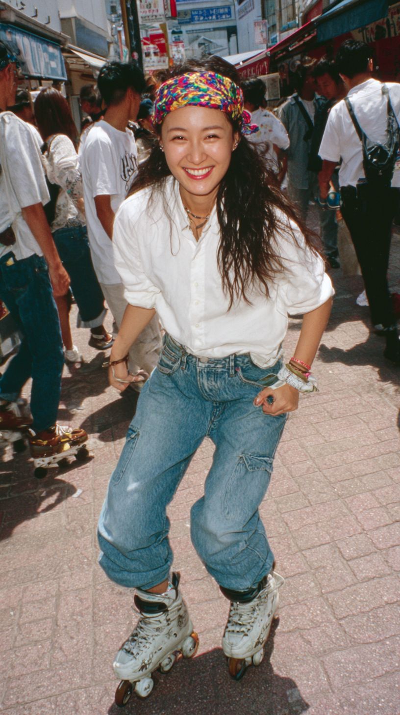 若い日本女性が渋谷の街でストリートウェアを着て、軽快な表情でローラーブレードを踊っている