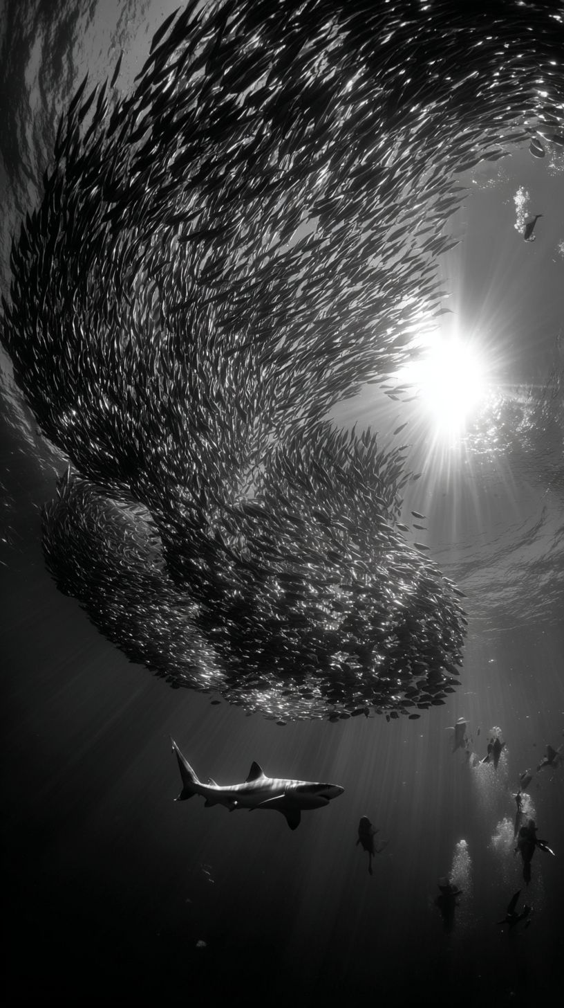 水中の小魚の単一の餌玉が形成する、動的な螺旋状の塊が、太陽の光が屈折して放射状のビームになる中で銀色にきらきらと輝いています。カメラの視点は、餌玉の周りをゆっくりと回っているように感じられ、催眠的な視差と流動的な動きを生み出しています。サメがフレームを通過し、明るい表面光に対して鮮明なシルエットを描き、魚たちをシフトする幾何学模様に収縮させます。高精細な白黒、長いトーンのグラデーション;層状の深さで漂う浮遊粒子。35mm ドキュメンタリー レンズ;鮮明な輪郭でスキャンされた 35mm ネガティブ グレイン、デジタルの厳しさはありません。