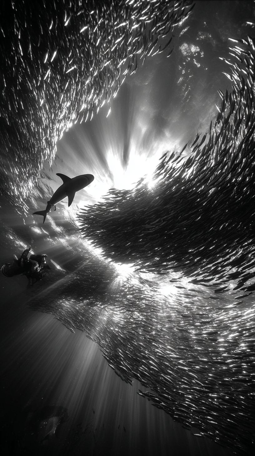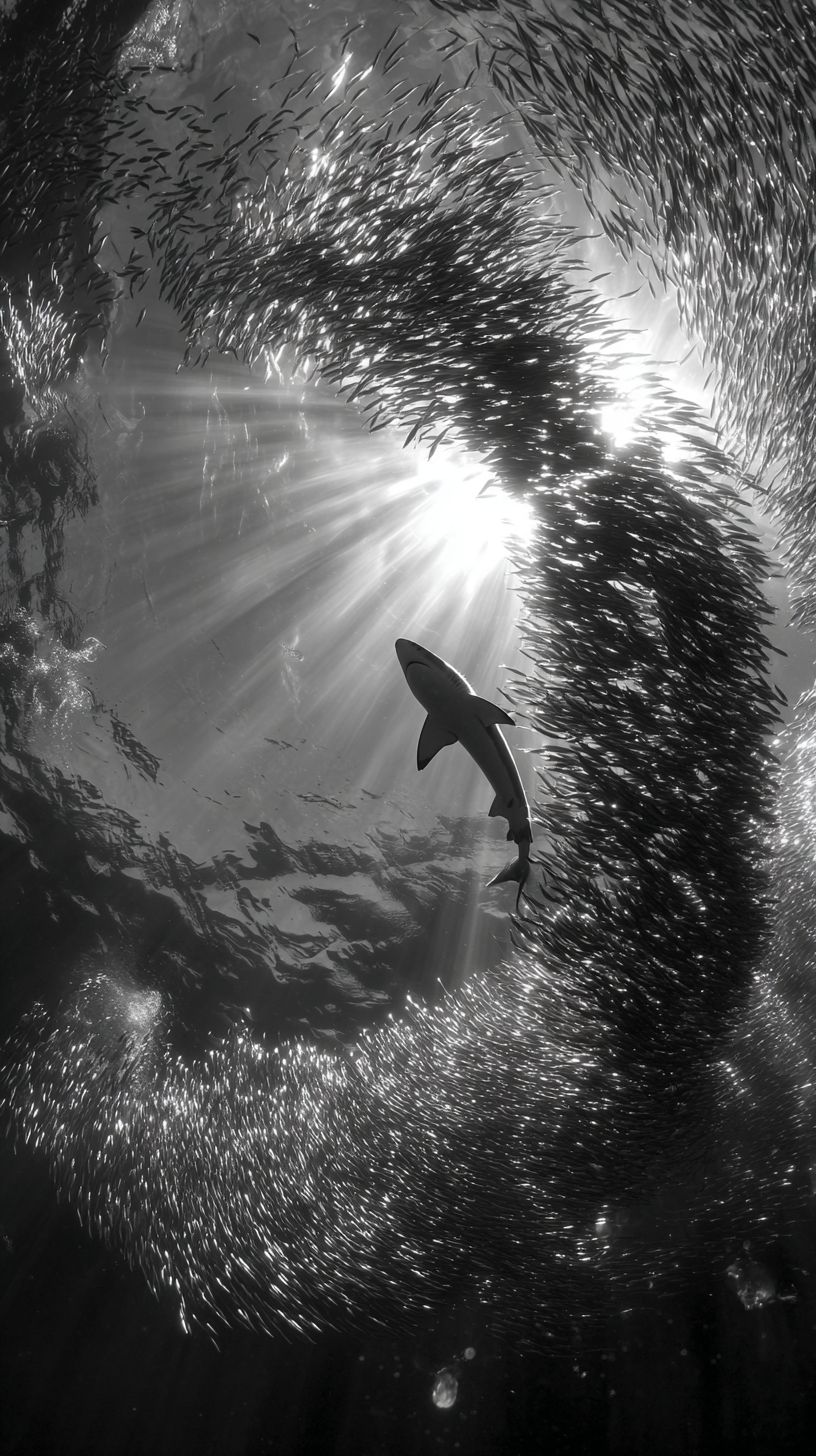 A single bait ball of small fish underwater forming a dynamic spiraling mass, shimmering in silver as sunlight refracts into radiant beams. Camera perspective feels as if orbiting slowly around the bait ball, creating hypnotic parallax and fluid motion. A shark passes through frame, silhouette sharp against bright surface light, causing the fish to contract into shifting geometric patterns. High-definition black and white with long tonal gradients; suspended particles drifting in layered depth. 35mm documentary lens; scanned 35mm negative grain with crisp contours, no digital harshness. --no overexposed, underexposed, cartoon outlines, text, watermark, distorted proportions, noisy backgrounds, harsh HDR, oversaturated colors --chaos 5 --ar 9:16 --raw --stylize 50 --v 7.0 --p 78soi4x