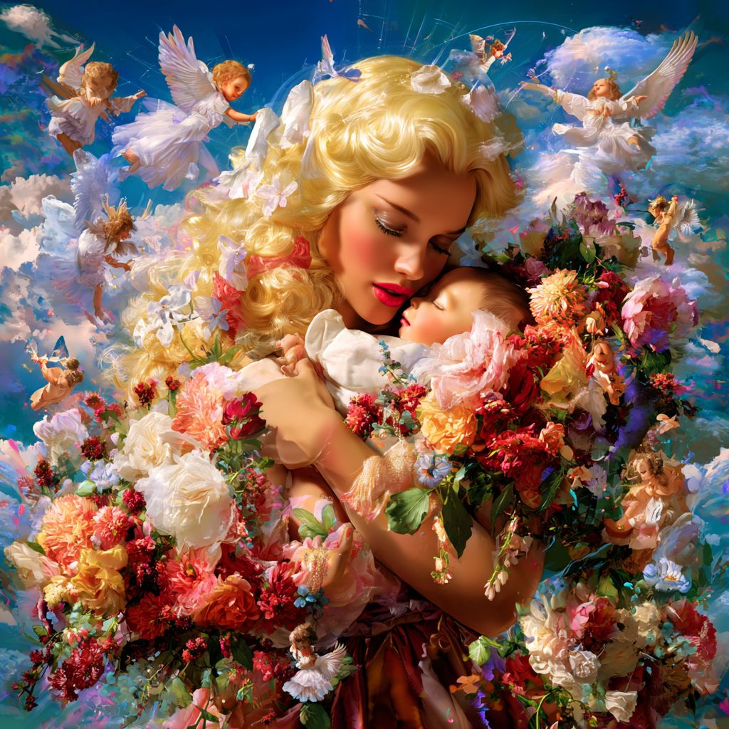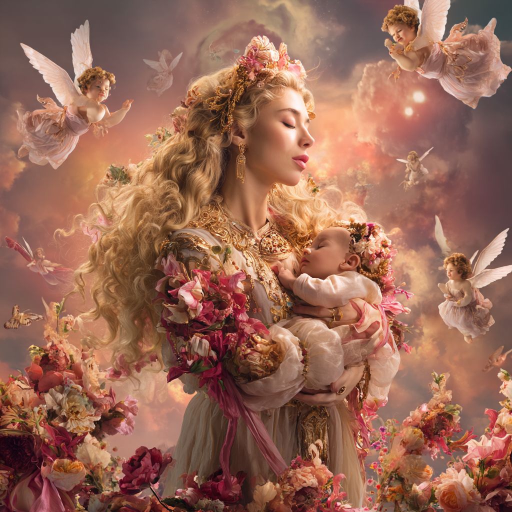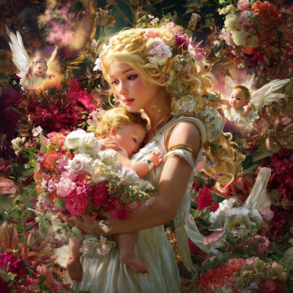 beautiful blond hair goddess Venus holding a baby,flowers and baby angels flying around --v 7.0 --p 78soi4x --s 50