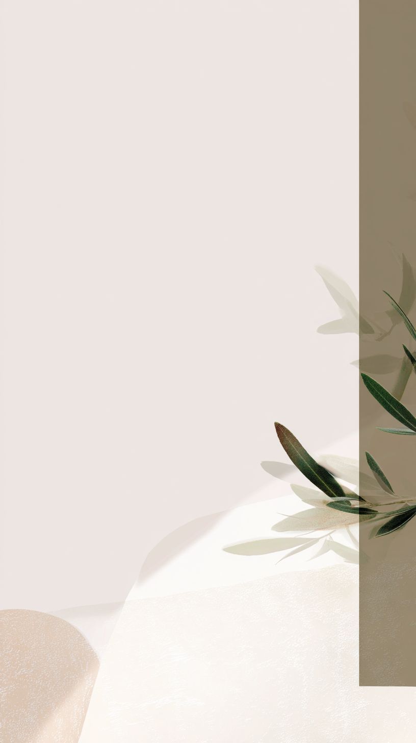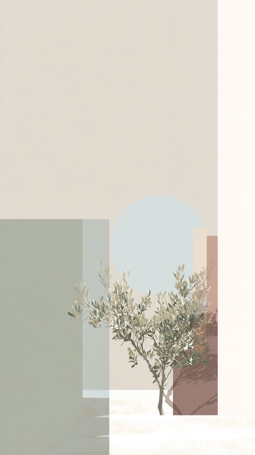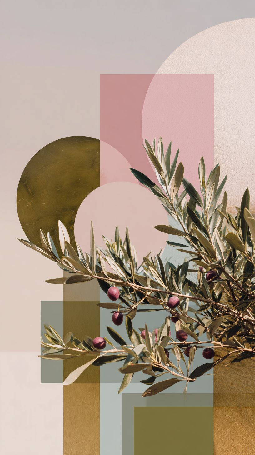 Create a minimalist, clean image on a collage background of light colors, with a partial olive tree on the right side in modern colors --ar 9:16 --v 7.0 --p 78soi4x --s 50