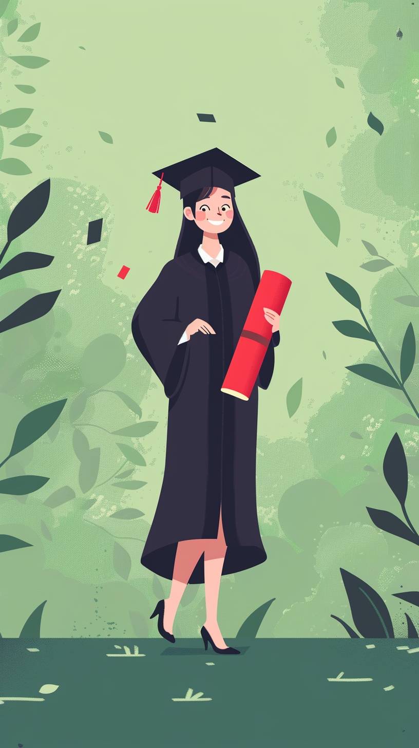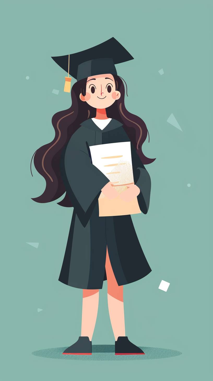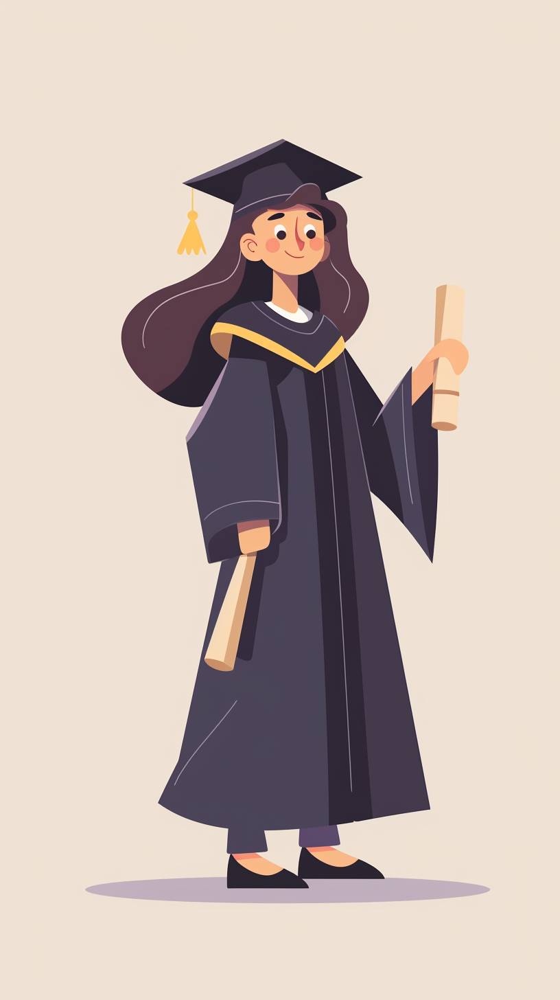 大学の卒業 gown を着て、巻物を手に持ち、観客に向かっている美しい女の子のフラットUI画像をデザインしてください。
