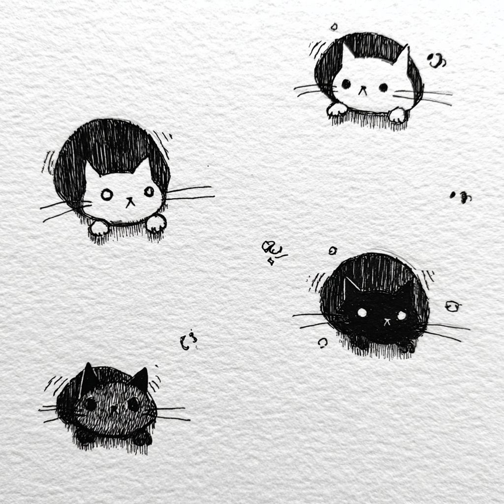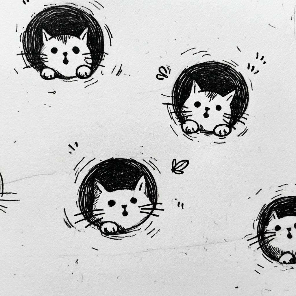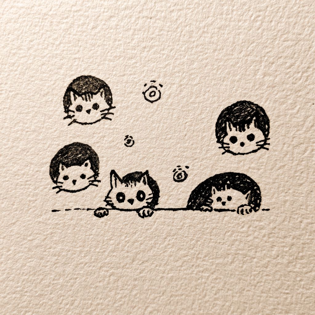 hand-drawn doodle style cats peeking out of round holes, simple black ink sketch, thick uneven marker lines, cute naive illustration, cat heads with tiny paws on the hole edge, each cat has a different emotion, minimal facial features, small doodle symbols above heads, white paper background, flat 2D, no shading, looks like a sketchbook drawing, warm, playful, unique style --v 7.0