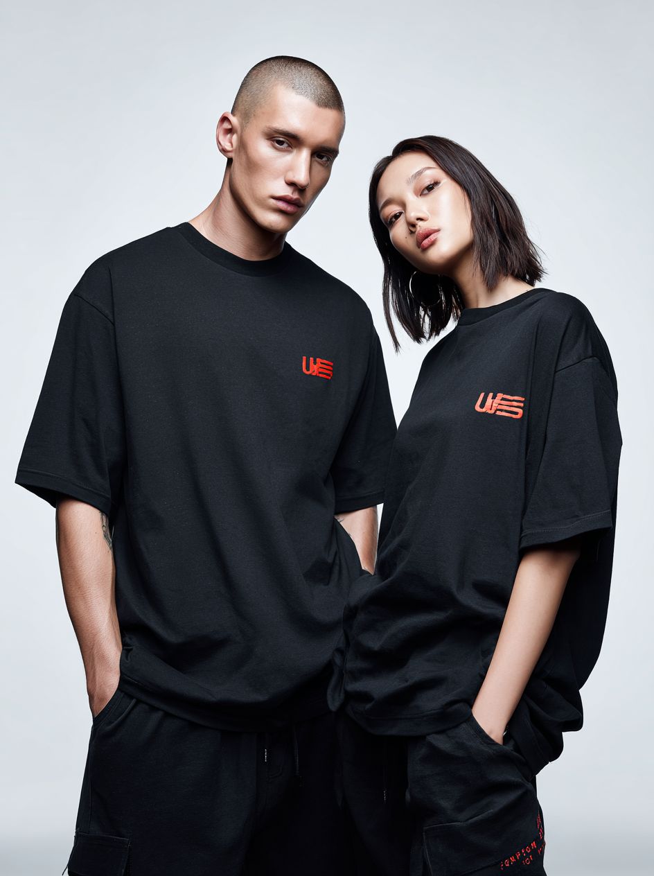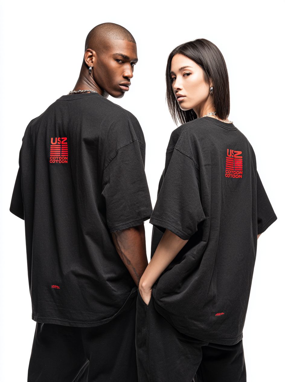 a male and female model wearing black oversized t-shirts with "uz cotton" text on the back, front view, white background, red logo print on the chest area, professional photography, depth of field. --ar 95:128 --profile zlrcshz --v 7.0