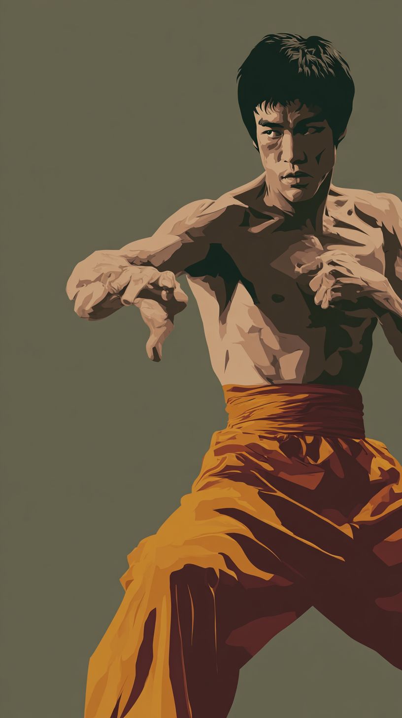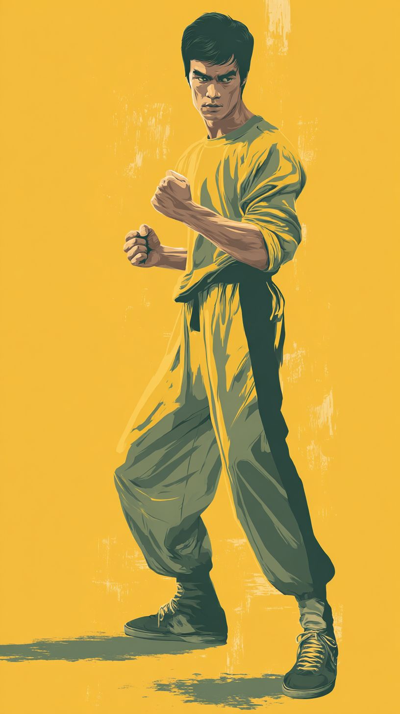 Bruce Lee inspired character poster, classic fighting stance, coiled energy and readiness, minimalist flat background, vector digital art style, sharp outlines, restrained color palette, cinematic lighting translated into graphic shading, modern martial arts poster design --ar 9:16 --v 7.0