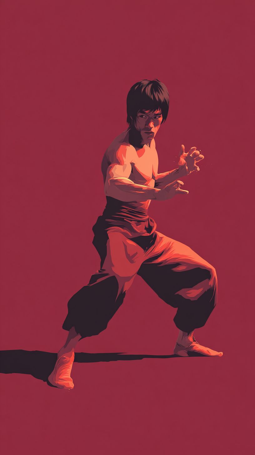 ブルース・リーにインスパイアされたキャラクターポスター、クラシックな戦闘姿勢、蓄えたエネルギーと準備、ミニマリストのフラットな背景、ベクターデジタルアートスタイル、鋭い輪郭、控えめなカラーパレット、映画的な照明をグラフィックの陰影に変換、現代武道のポスターデザイン