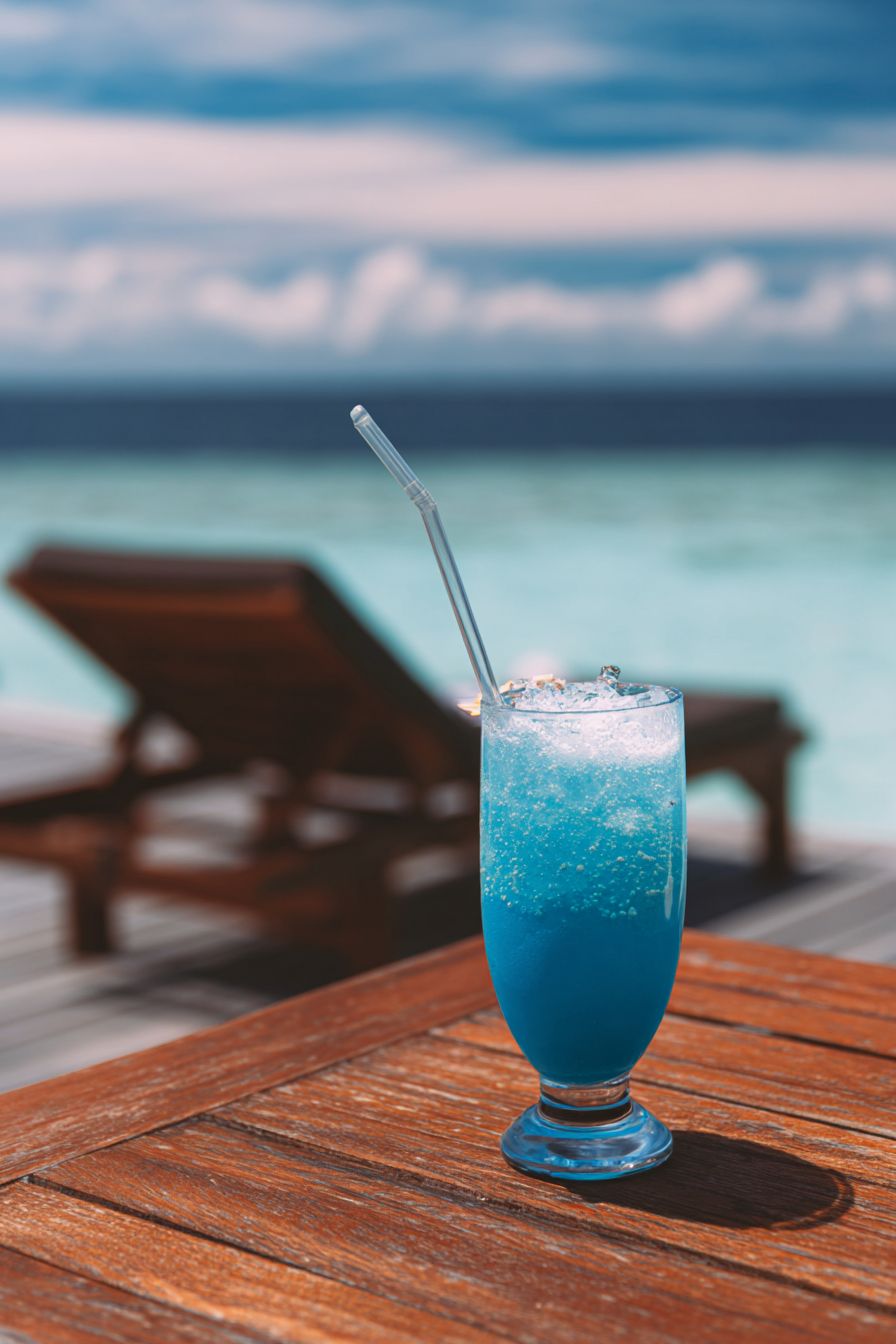 a stock photo of a close up of a blue drink on a table on a private island. --ar 2:3 --s 50 --v 7.0 --raw