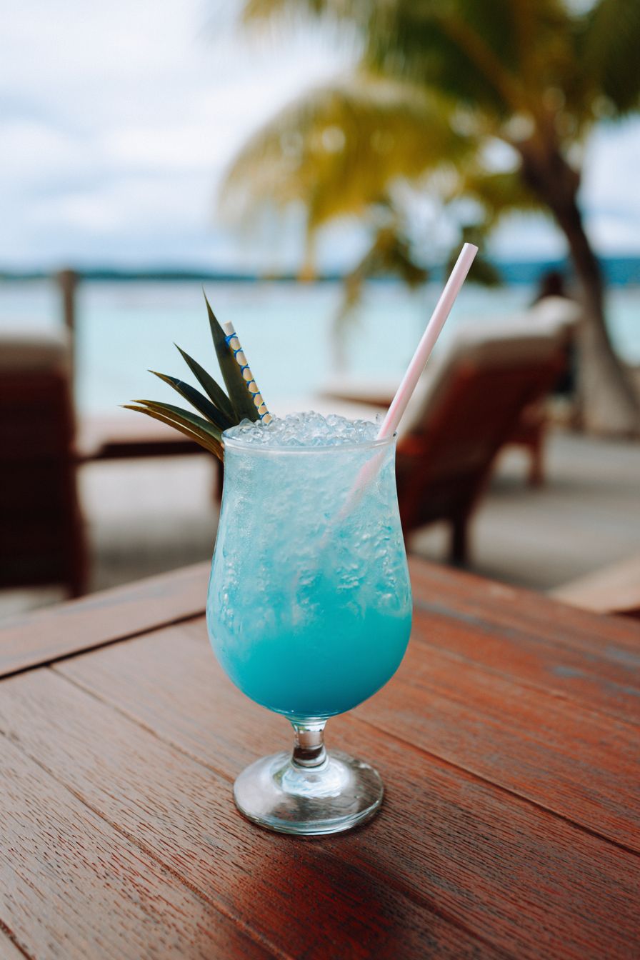 プライベートアイランドのテーブルに置かれた青い飲み物のクローズアップ