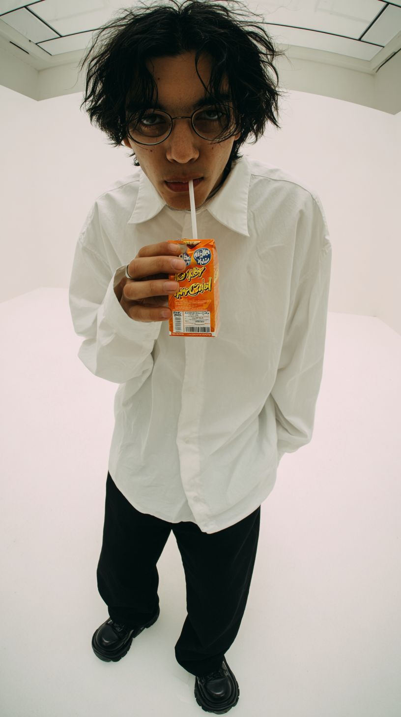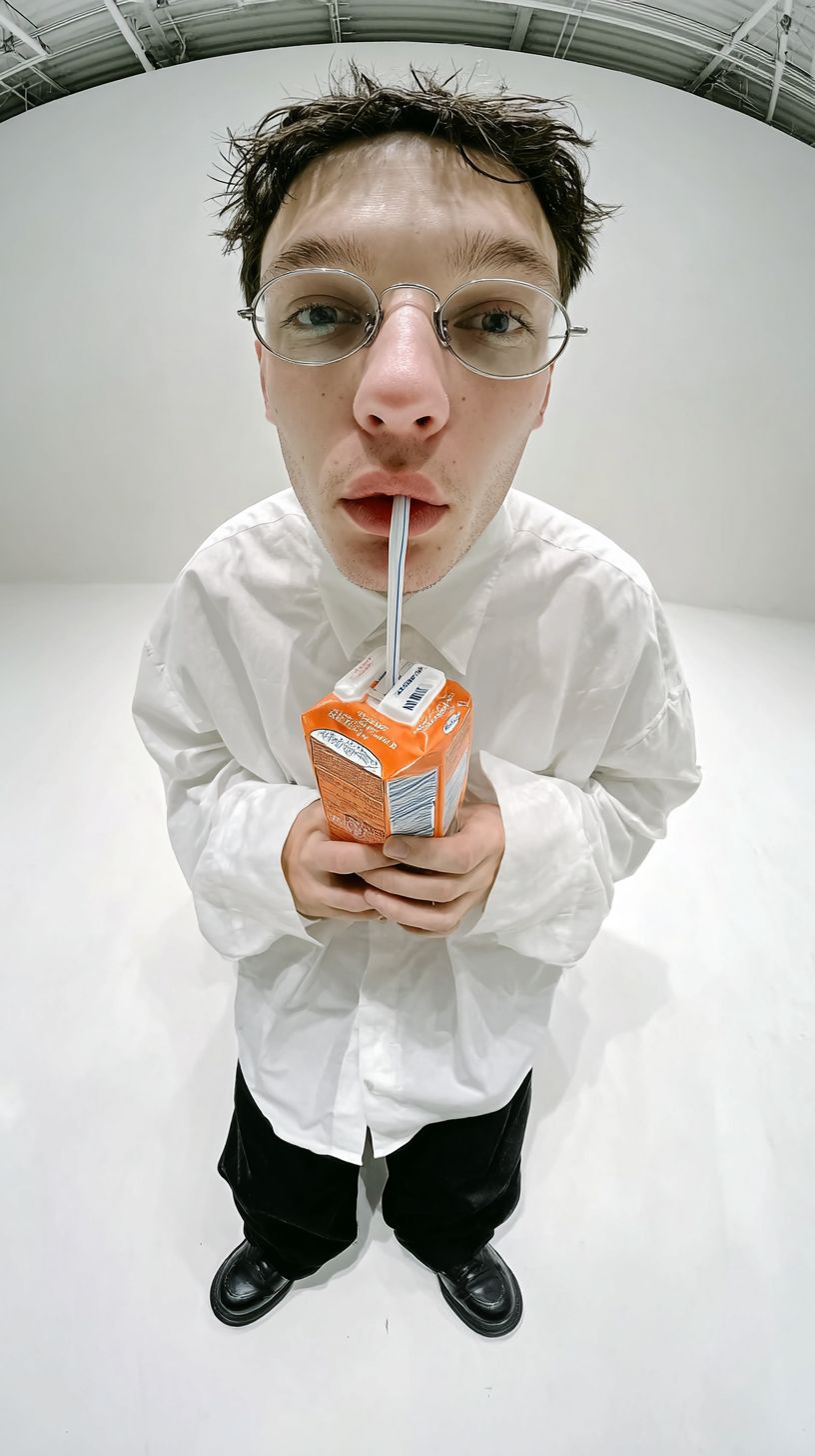 無限の白い虚空に立つ若い男性のフォトリアリスティックなクローズアップポートレート。壁や天井は見えず、シームレスな白いサイクリューマのようです。カメラは彼の顔に非常に近く、超広角の14mmレンズで撮影され、微妙な遠近感の歪みがあります。彼の顔はフレームの中心にあります。彼は小さな段ボールのジュースパックからストローでジュースを飲んでおり、そのパッケージは2000年代初頭のレトロなテクノロジーの雰囲気を持ち、Windows XPのカラーブロックにインスパイアされています(読み取れるブランド名はありません)。彼はオーバーサイズの真っ白なボタンダウンシャツ、ゆったりとした黒のズボン、しっかりした黒の靴、細い円形のメガネ、少し乱れた黒髪を持ち、落ち着いた無関心な表情をしています。上からやや前方からの柔らかなスタジオ照明、優しい影、肌と生地のディテールが高く、パックのわずかな光沢のハイライト、目とストローに焦点を合わせた浅い被写界深度。