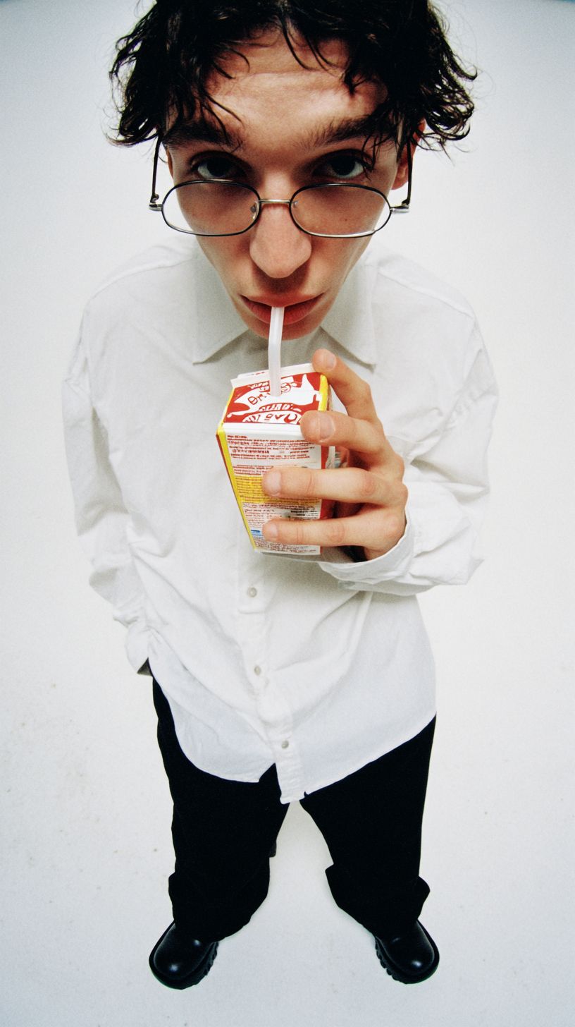 Photorealistic close-up portrait of a young man standing in an infinite white void with no visible walls or ceiling, like a seamless white cyclorama. The camera is very close to his face, shot on an ultra-wide 14mm lens with subtle perspective distortion, his face centered in frame. He is drinking juice from a small cardboard carton with a straw; the carton has early-2000s retro tech packaging vibes inspired by Windows XP color blocks (no readable branding). He wears an oversized crisp white button-up shirt, loose black trousers, chunky black shoes, thin round glasses, slightly messy dark hair; calm, detached expression. Soft studio lighting from above and slightly front, gentle shadows, high skin and fabric detail, slight glossy highlights on the carton, shallow depth of field focused on the eyes and the straw. --ar 9:16 --profile 9s79iq5 --s 50 --raw
