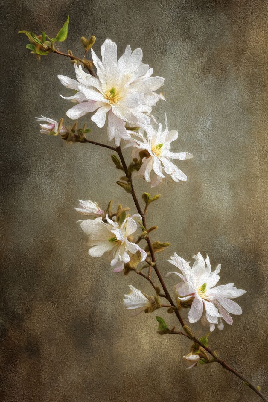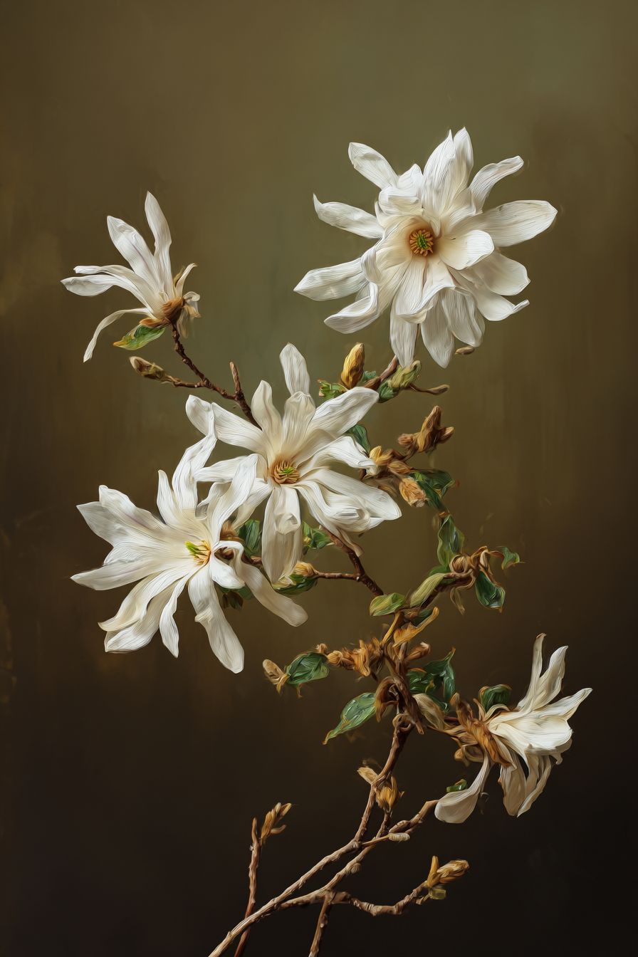 Create a vintage oil painting in old masters style of a white star magnolia branch with blossoms with numerous long, slender petals radiating outward from a yellow-green center. Muted colors --ar 2:3 --s 50 --raw