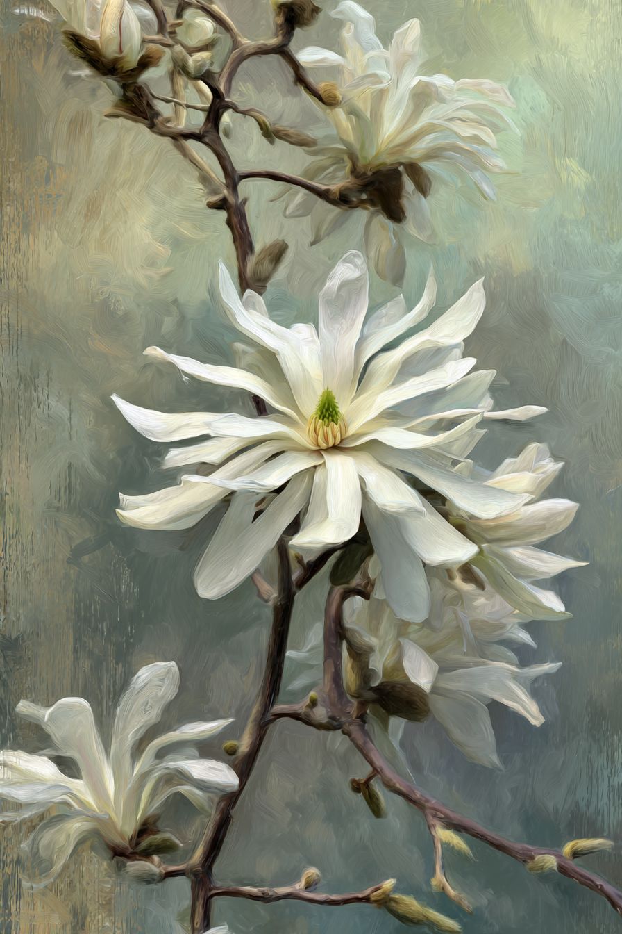 古典的油絵を作成し、古典的なマスターのスタイルで、白い星木蓮の枝と花を描きます。花弁は細長く、黄緑色の中心から放射状に広がっています。 mutedな色合い。