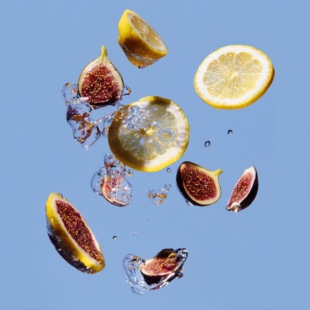 空色の背景に浮かぶスライスしたレモンとイチジク