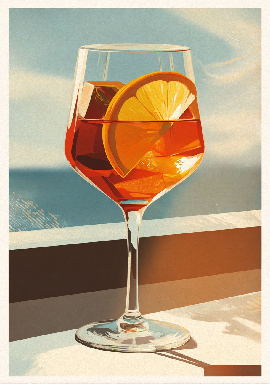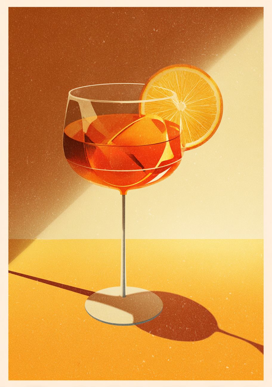 Retro cocktail poster, aperitif glass with orange slice, late afternoon sunlight, soft shadows, warm Mediterranean tones, mid-century graphic style, no typography --ar 70:99 --s 50 --raw