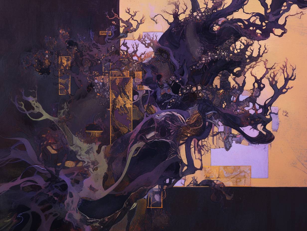 この絵は手描きスタイルで、超現実的でリアルなテーマを持ち、アクリルとデジタルアートを組み合わせて内面的な動揺と生命を表現しています。