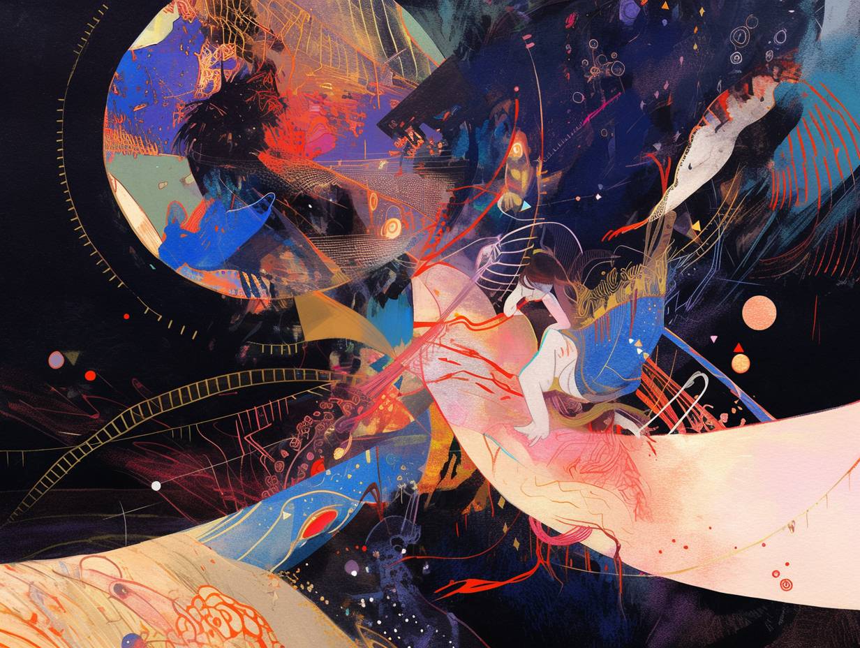 [テーマ]を手描きのスタイルで表現し、常識を超えて、原初、リアル、そして超現実を受け入れる。暗い風景の上で夢の深層から囁く秘密のように浮かび上がる。テーマは意識と無意識の間の綱渡りで踊り、空気のような形と鮮やかな幻影を呈する。メディウムは部分的にキャンバス上のアクリル、部分的にデジタルの魔法で、各ブラシストロークが抽象的なソナタの一音符となる質感の交響曲を作り出す。インスピレーションに包まれたスタイルは、フランシス・ベーコンとジャン=ミシェル・バスキアの精神を伝える。キャンバスはネオ表現主義のエネルギーで響き渡り、色の爆発やギザギザの線は内なる動揺と生き生きとした生活を語る。都市の荒々しさが感じられ、ネオンの光と影が月のスポットライトの中でワルツを踊る。現代的な現代アートのスタイルで、後現代の時代の囁きが漂い、境界がぼやけ、予期せぬものがミューズになる。これは、心の目が心臓が抱えきれないほど多くを見ている、常に変化する世界の視覚詩である。