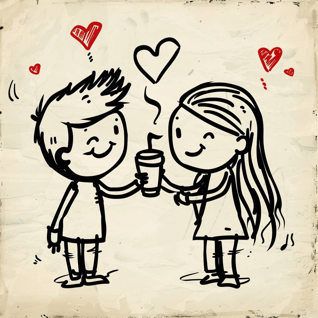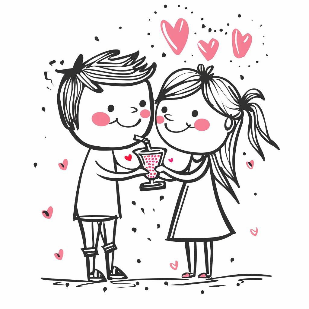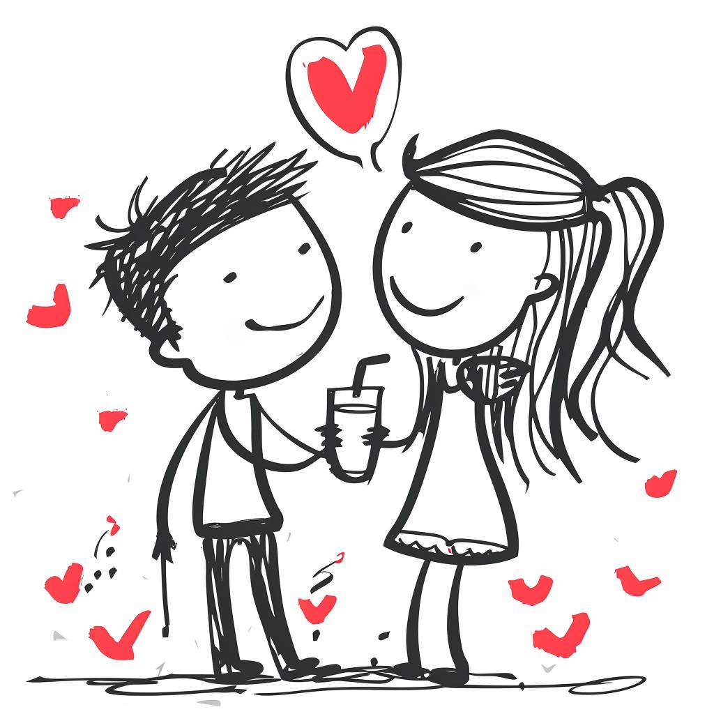 愛し合うカップルが飲み物を分かち合う手描きのカートゥーンスタイルの2Dスティックフィギュア、ハートがあり、非常に詳細で高品質。