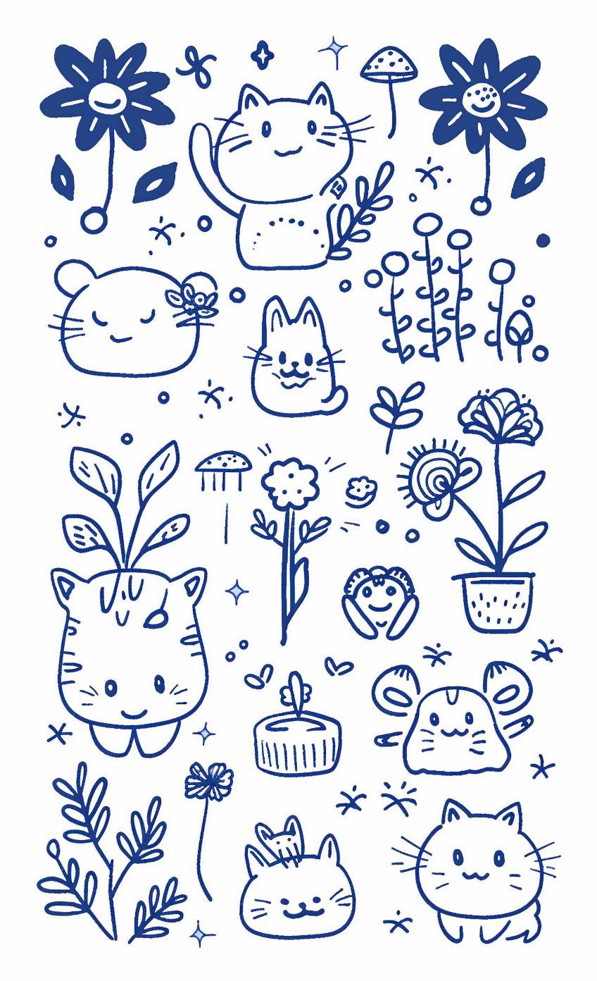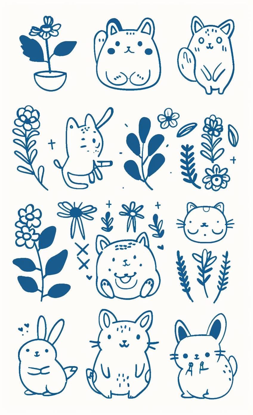 Cute stickers, simple line drawings of cute characters with various symbols and words written on them such as "Fed povu summer day plants and flowers jump hello my girl how area is so good! Dark blue outline, white background, simple details, minimalism, Japanese manga style. The lines have no shadows or shading, giving it an elegant appearance. A sticker sheet design featuring multiple designs in one artwork. There should be some space between each character for coloring. , high resolution, --ar 39:64 --v 6.0