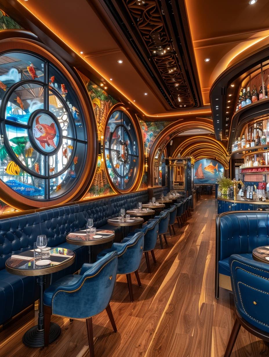 A cafe with many ice cubes embedded on its walls. a lot of goldfish::3 ,under water,sofa,minimalism,modern,by zaha hadid,dark,night,light::1 --chaos 45 --ar 3:4 --stylize 400 --iw 0.4 --v 6.0
