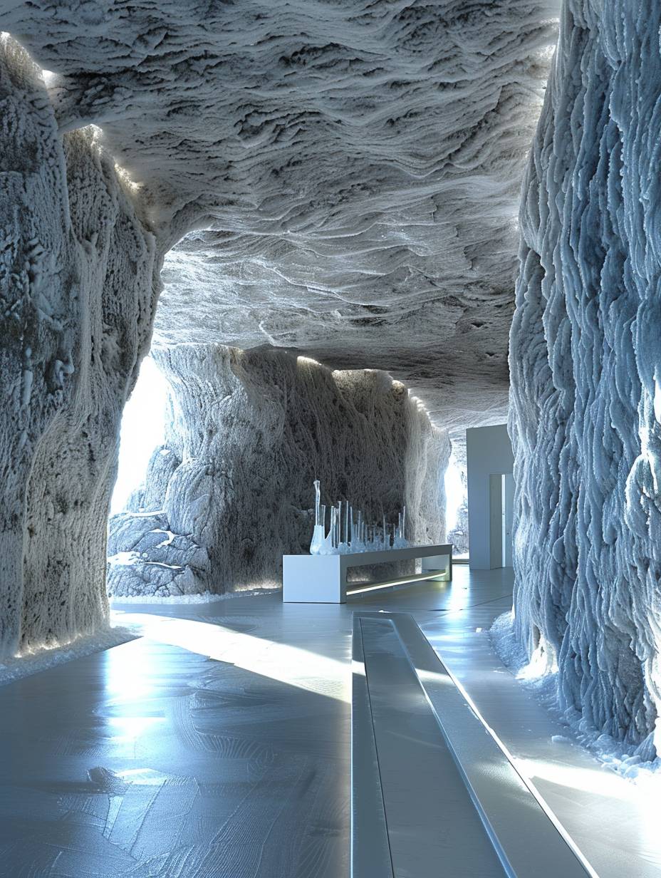壁に氷の塊が埋め込まれたカフェに多くの金魚が泳ぎ、現代的でミニマリストなデザイン。
