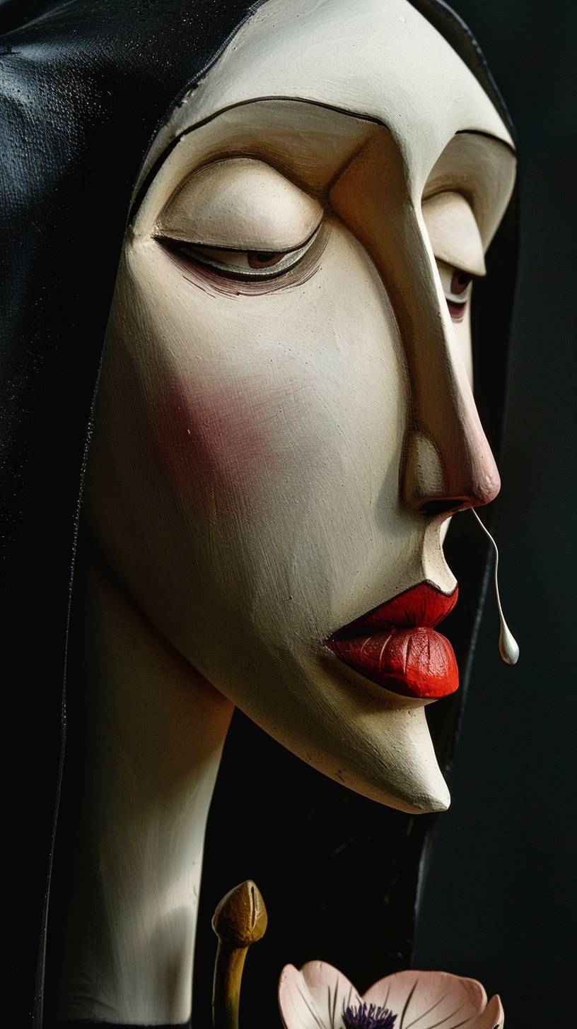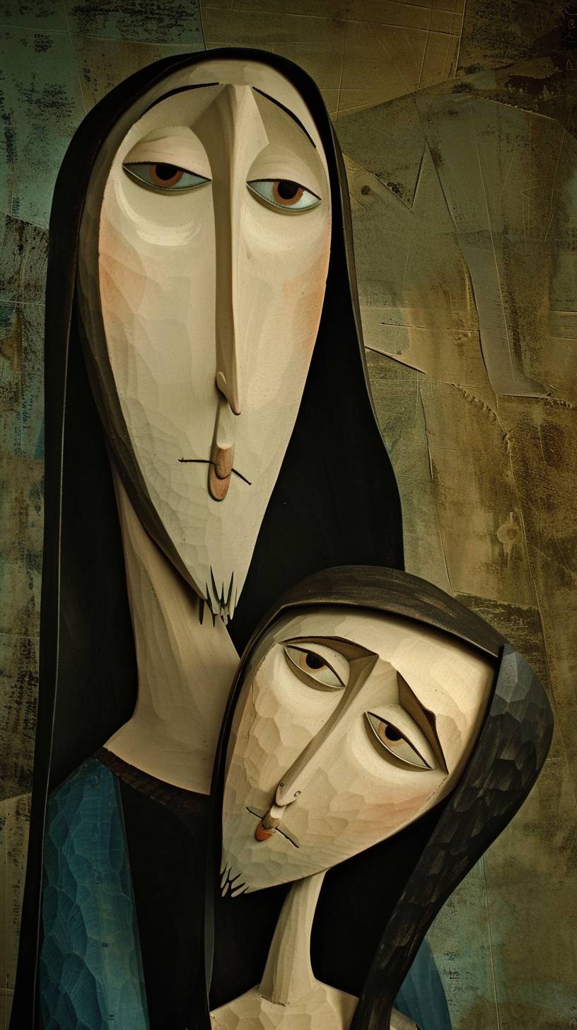 studio professional photo. very close view. Madonna with child like a flower. caricature. Elongated faces and neck. long nose, slingy face. Modigliani style. large eyelids. --ar 9:16 --v 6.0