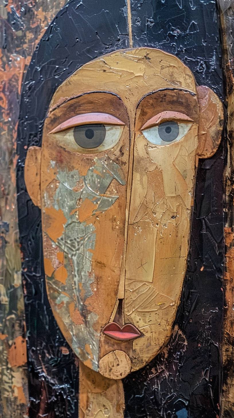 モディリアーニスタイルのマドンナと子供の肖像、顔と首が長く、長い鼻と大きなまぶたが特徴です。