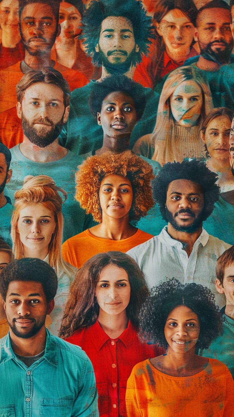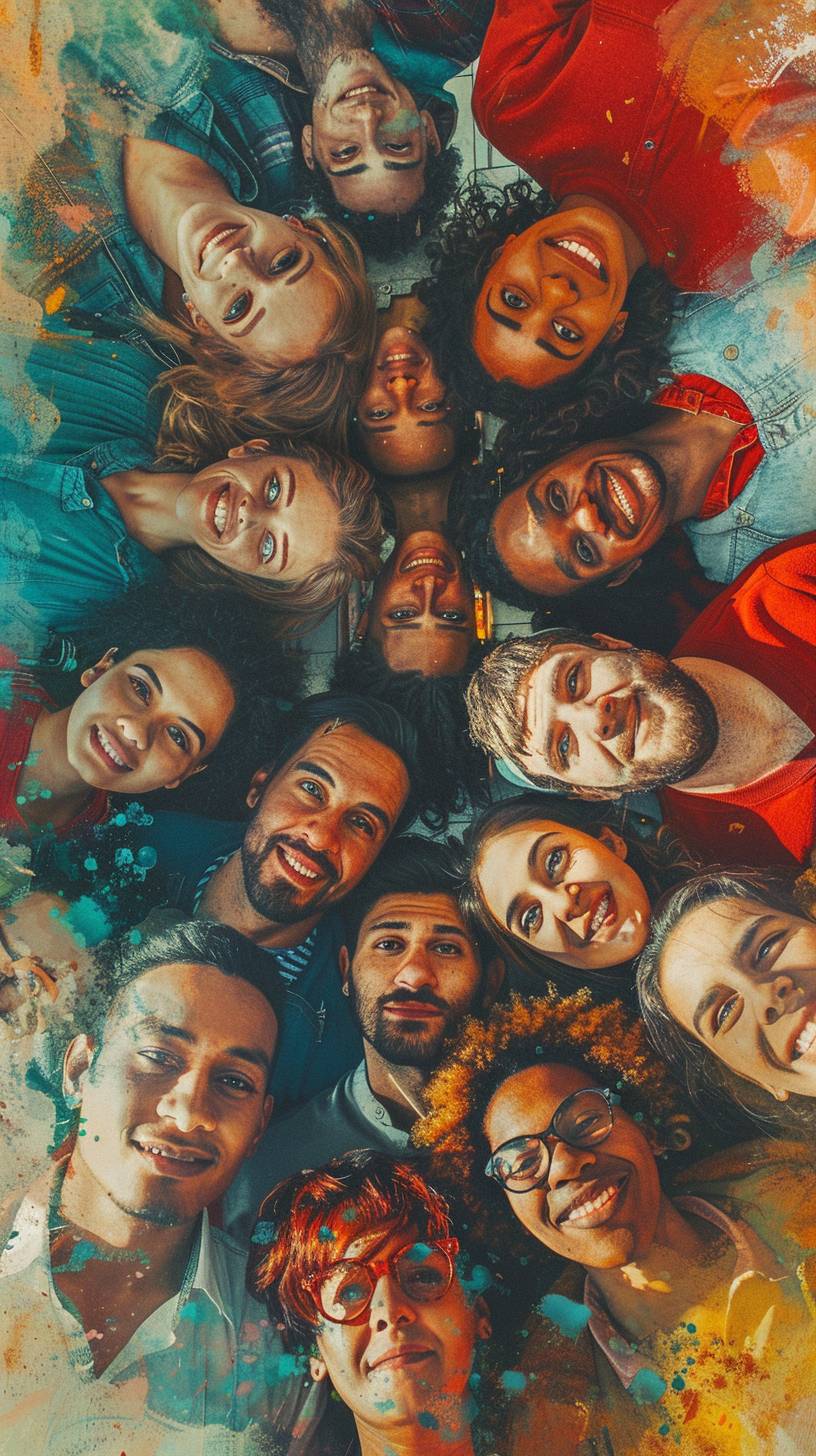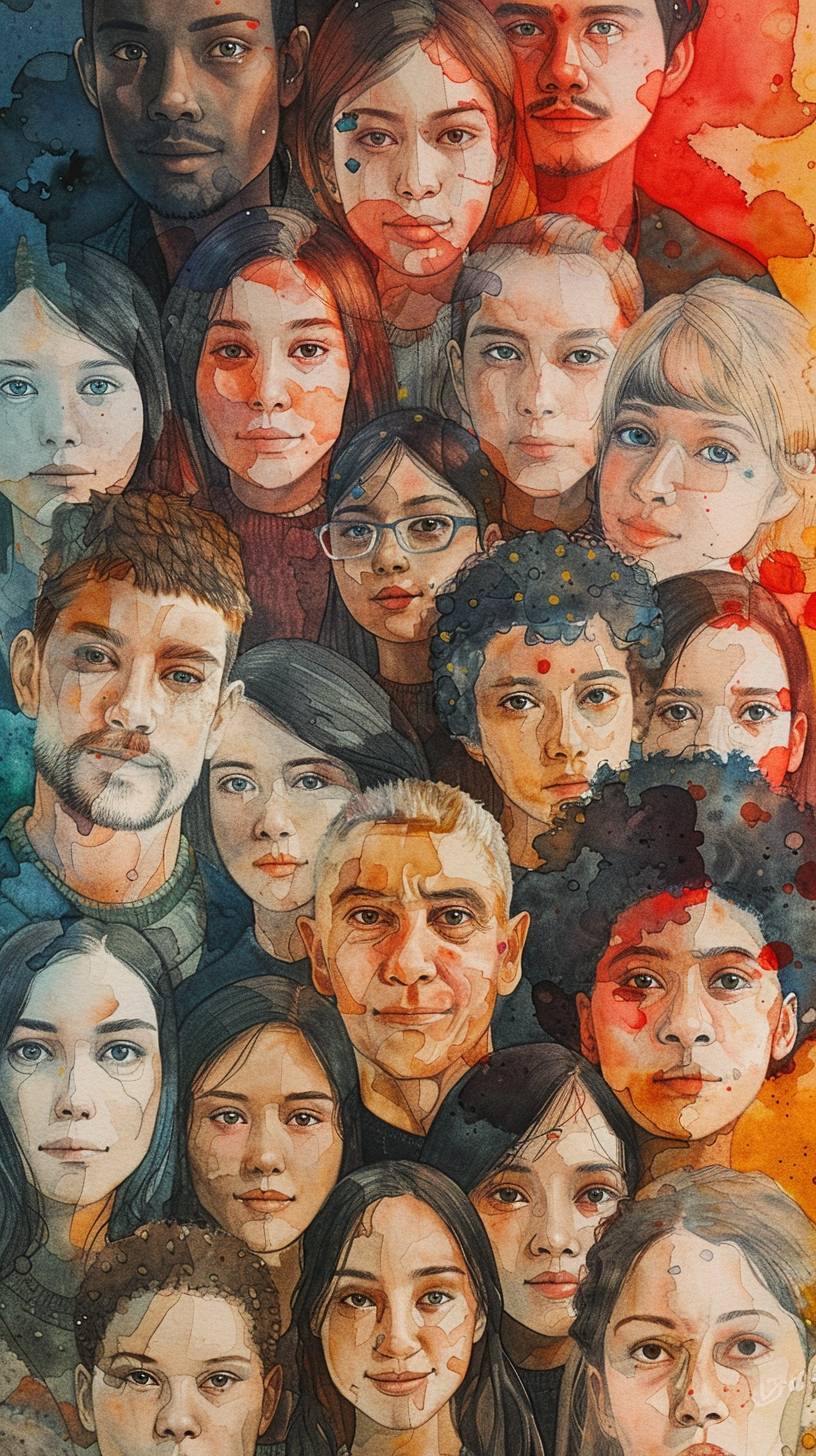 sketch, watercolor painting style. Directly above a large multi-ethnic group of people looking at the camera. Concept of teamwork, democracy, happy people, pride, fairness, 32k UHD --ar 9:16 --stylize 250 --v 6.0