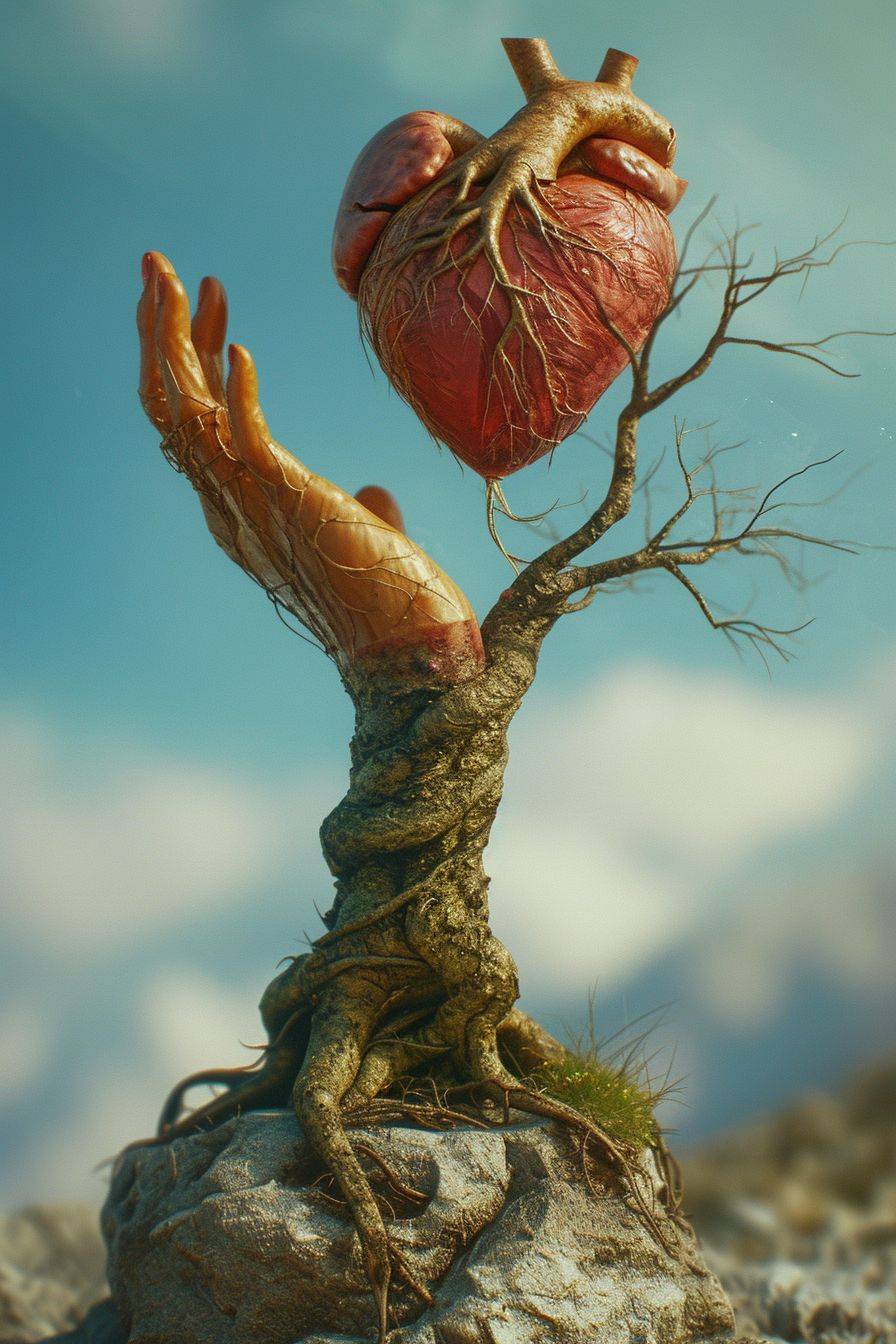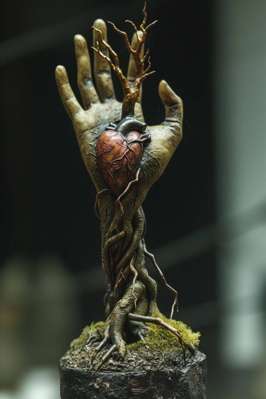 sculpture of a hand stretching up towards a heart growing up like a tree from the ground, hand inspired by Venus, hyper - realistic, ultra resolution,, cinematic , photo realistic ::5 , sharp, very detailed, exquisite detail, 30 - megapixel, 4k, vi8k, 50 - mm - lens, sharp - focus, intricately - detailed, long exposure time, f/ 8, ISO 100, shutter - speed 1/ 125, diffuse - back - lighting, award - winning photograph, facing - camera, looking - into - camera, monovisions, elle, small - catchlight, low - contrast, High - sharpness, facial - symmetry, depth - of - field, golden - hour, ultra - detailed photography, shiny metal surface with intricate swirling mother of pearl inlays, raytraced, global illumination ::1 --ar 2:3 --v 6
