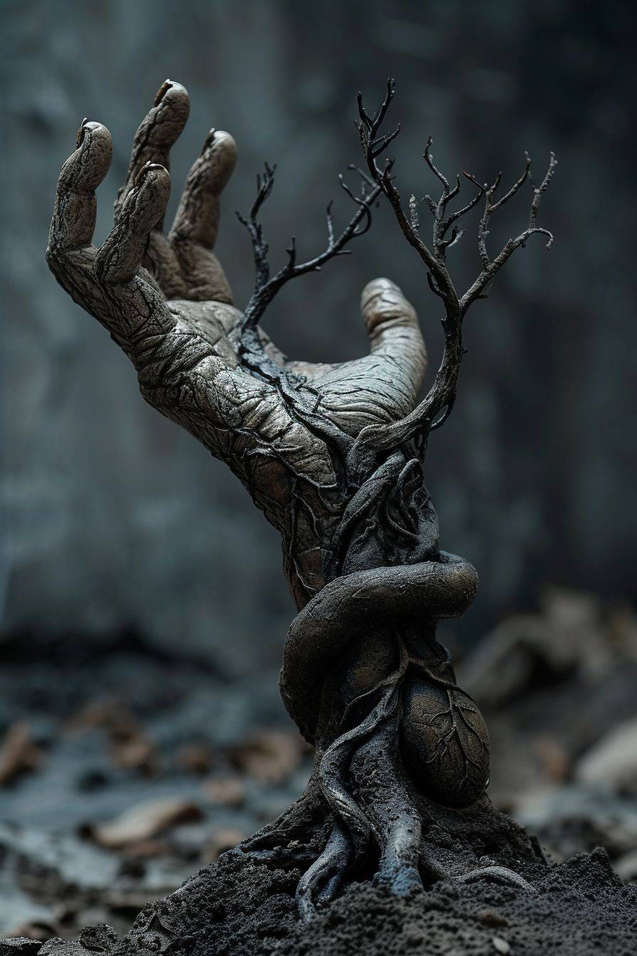 地面から伸びるハート型の木に手を伸ばす、ヴィーナスに触発された超リアルな彫刻、ディテールが豊富な映画のような写真作品。