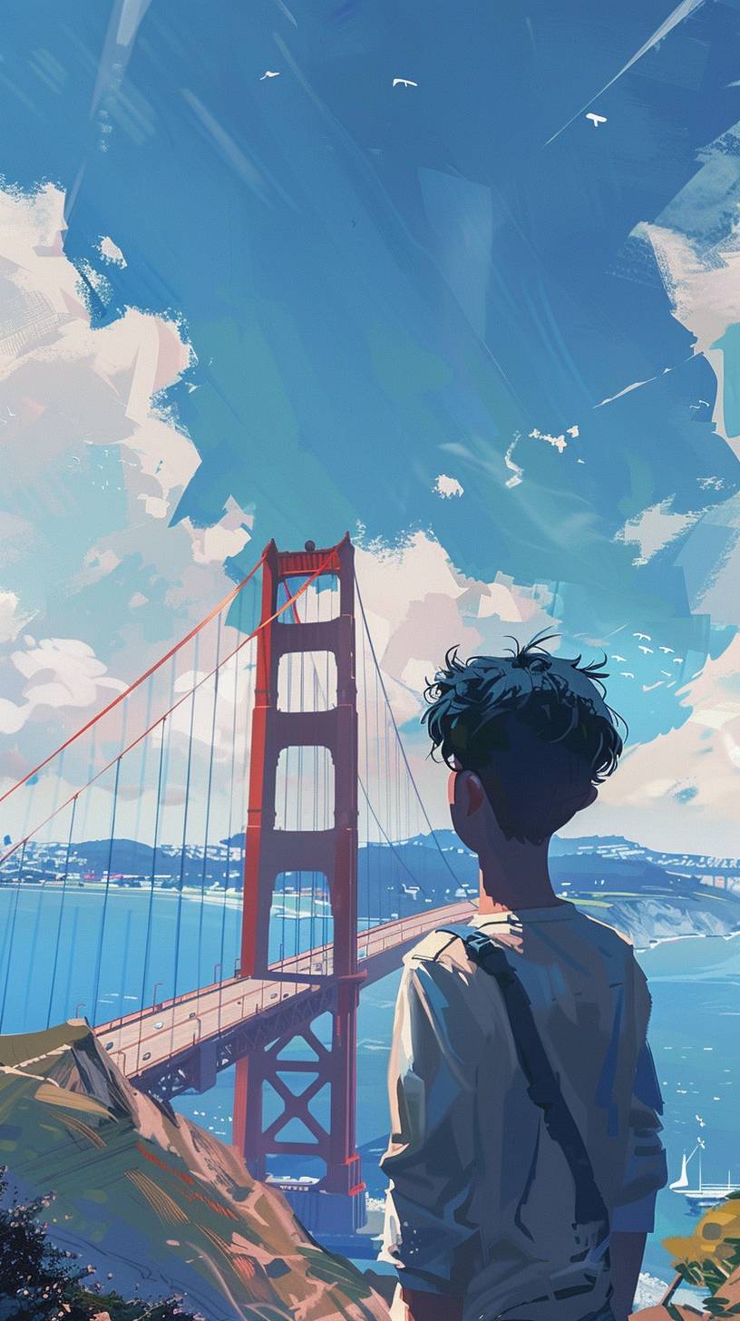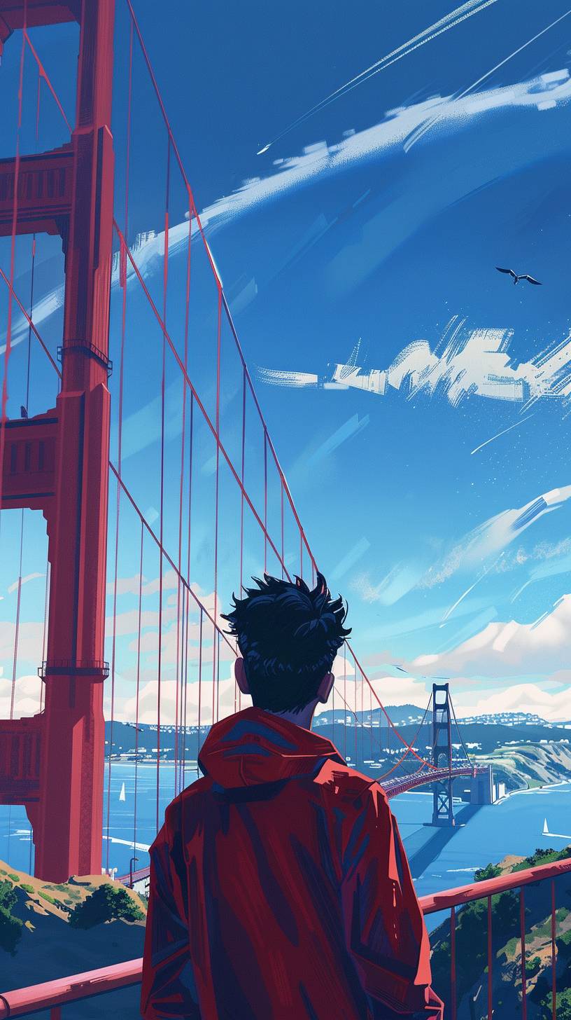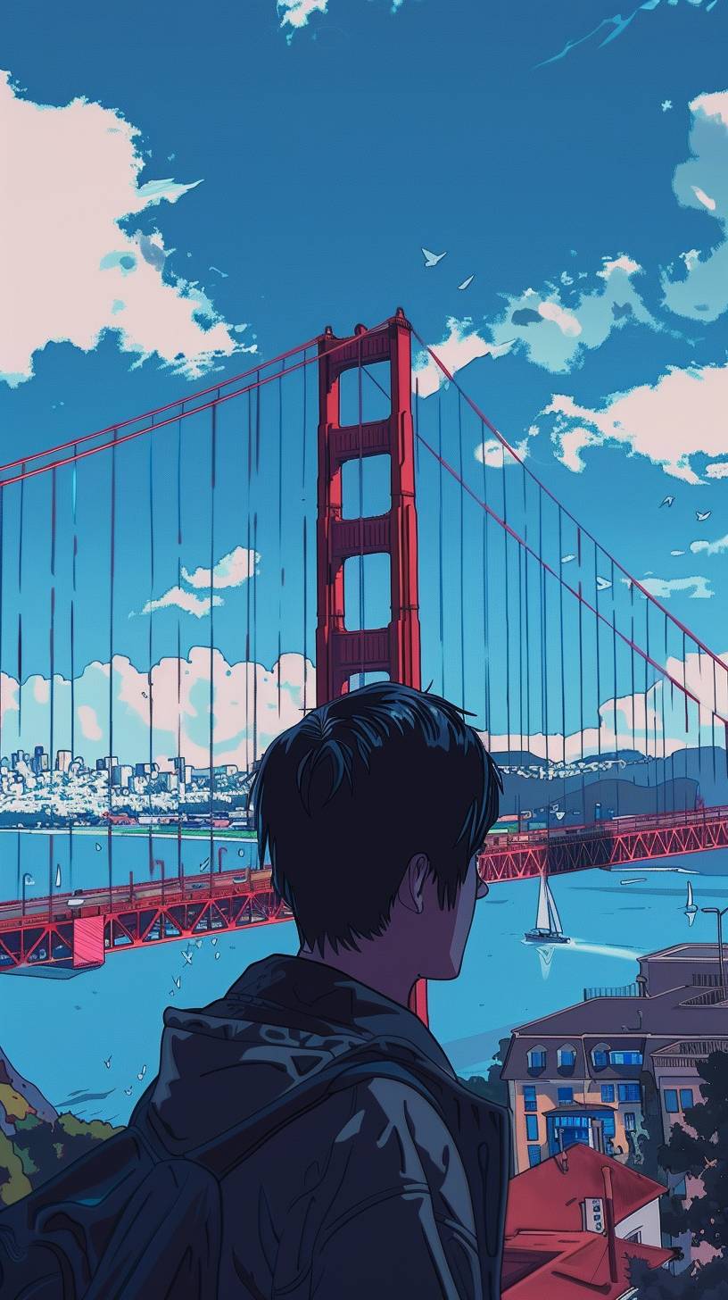 1980年代のマクロスやロボテックアニメシリーズのスタイルで描かれたサンフランシスコのゴールデンゲートブリッジの絵。青空の下、若者がマリンから都市を見つめながらゴールデンゲートブリッジを見ています。風が吹いていて、彼は野心的に見え、真っ黒な髪を持っています。
